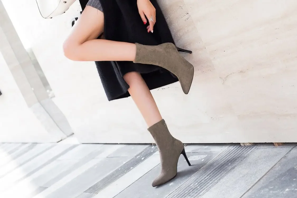 2024 Women Boots Short High Heels Shoes for Women Autumn Suede Imitation Leather Ankle Boots Black Sock Women Heels Boots Female