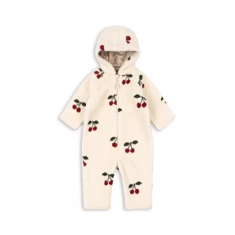 2025 Winter Long Sleeve Baby Fleece Hooded Jumpsuit Cherry Print Infant Warm Romper Crawling Outfit Newborn Clothes