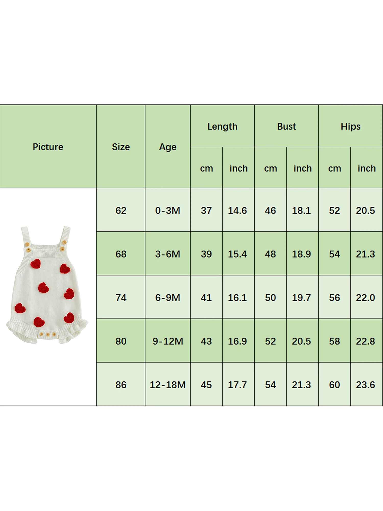 68 Length: 15.4 Bust: 18.9 Hip: 21.3 Advised Age: 3-6 Months
