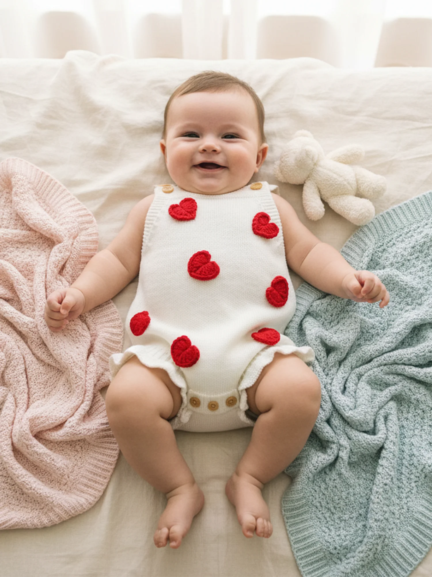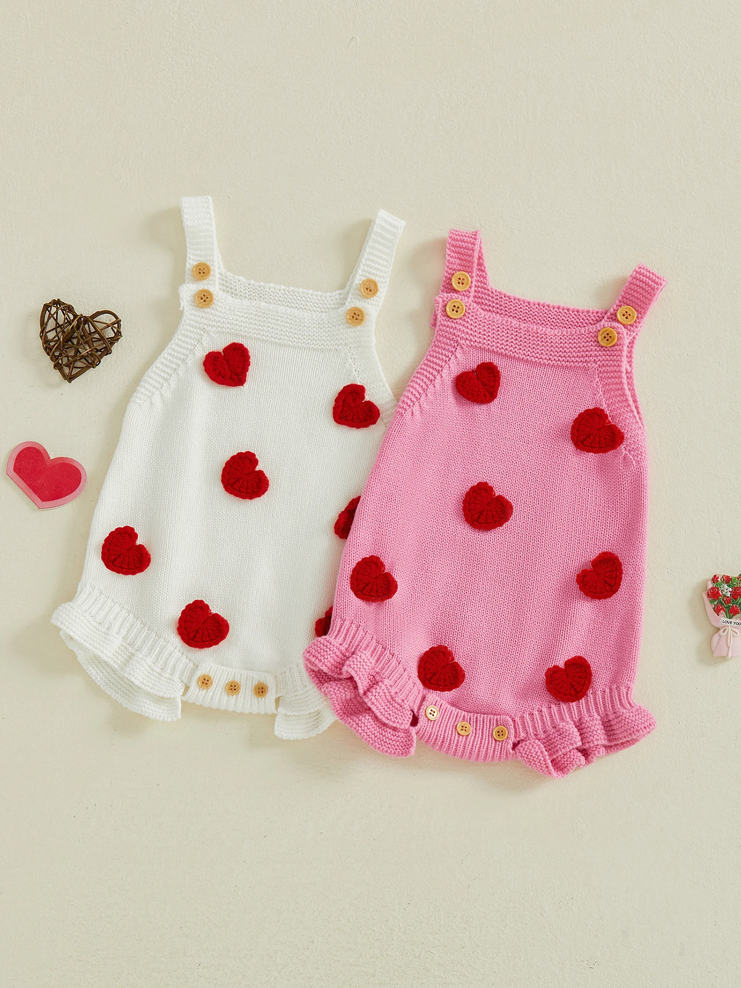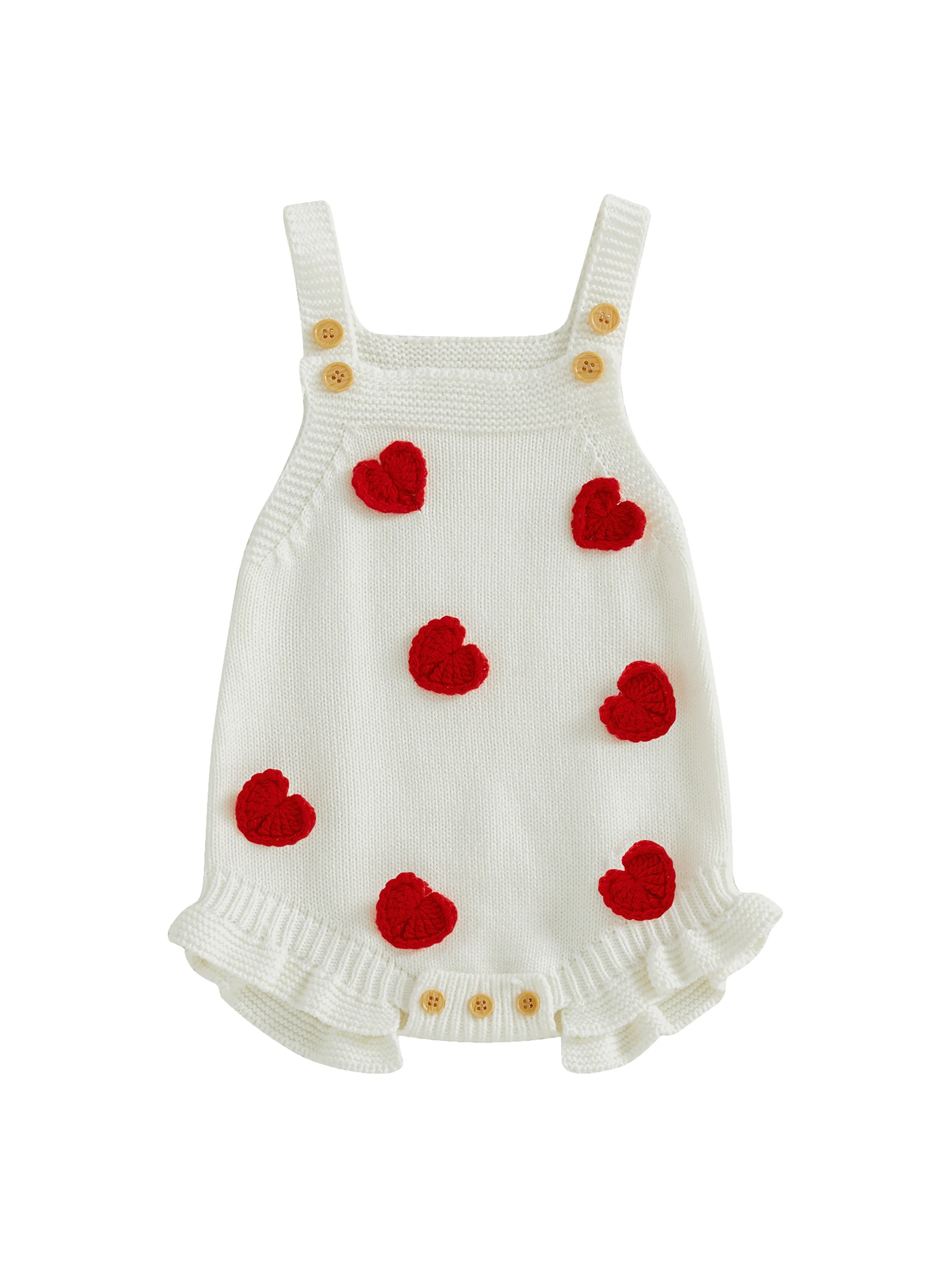 Baby Girl Valentines Day Romper Sleeveless Square Neck Heart Bodysuit Newborn Knit Overalls