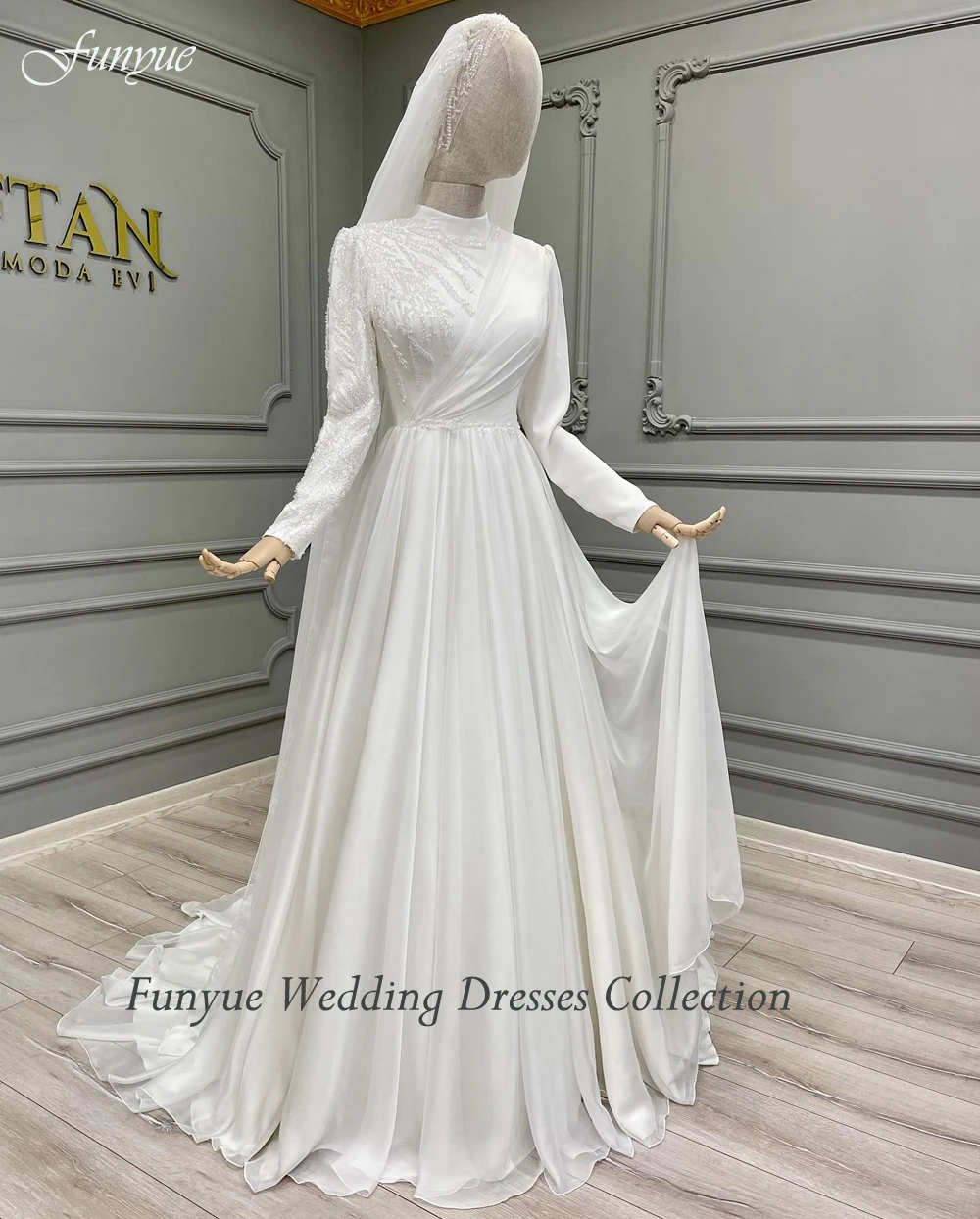 Customized Full Sleeve Muslim Wedding Dress 2025 New High Neck A-Line Chiffon Beading Bridal Gown for Bride To Be Robe De Mariée