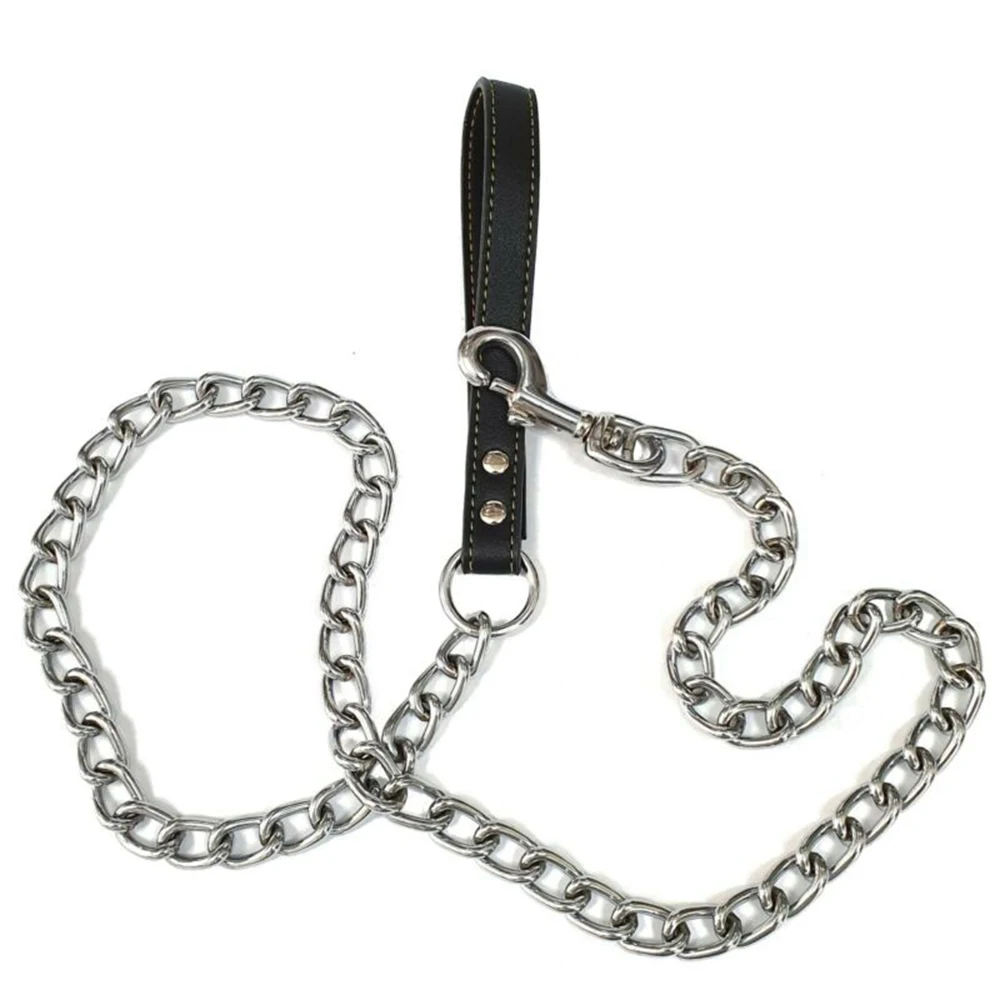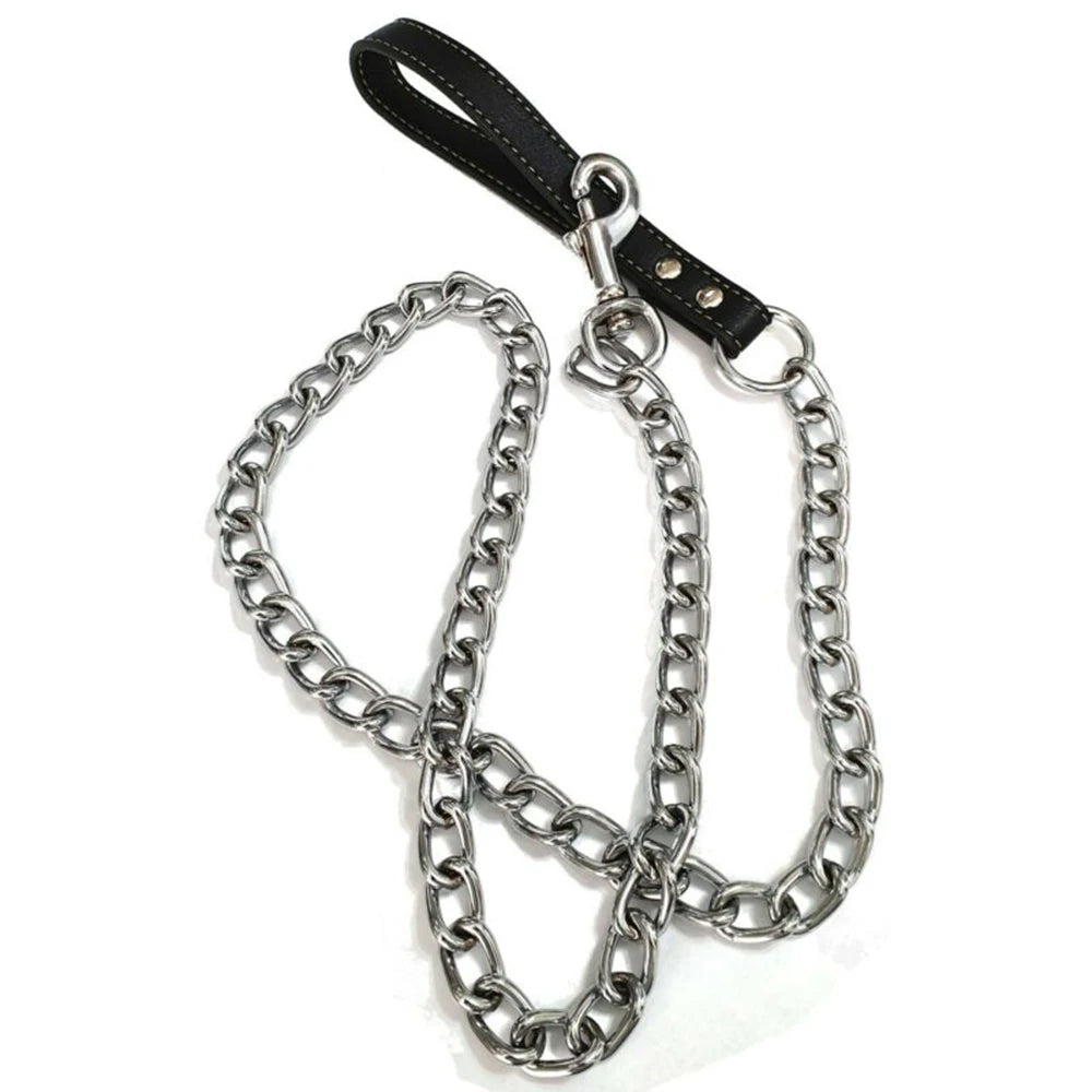 Durable Pet Dog Chain Metal Leash For Small Medium Dog PU Handle Leather Iron Chain Leash Anti-Bite Chain Dog Accessories