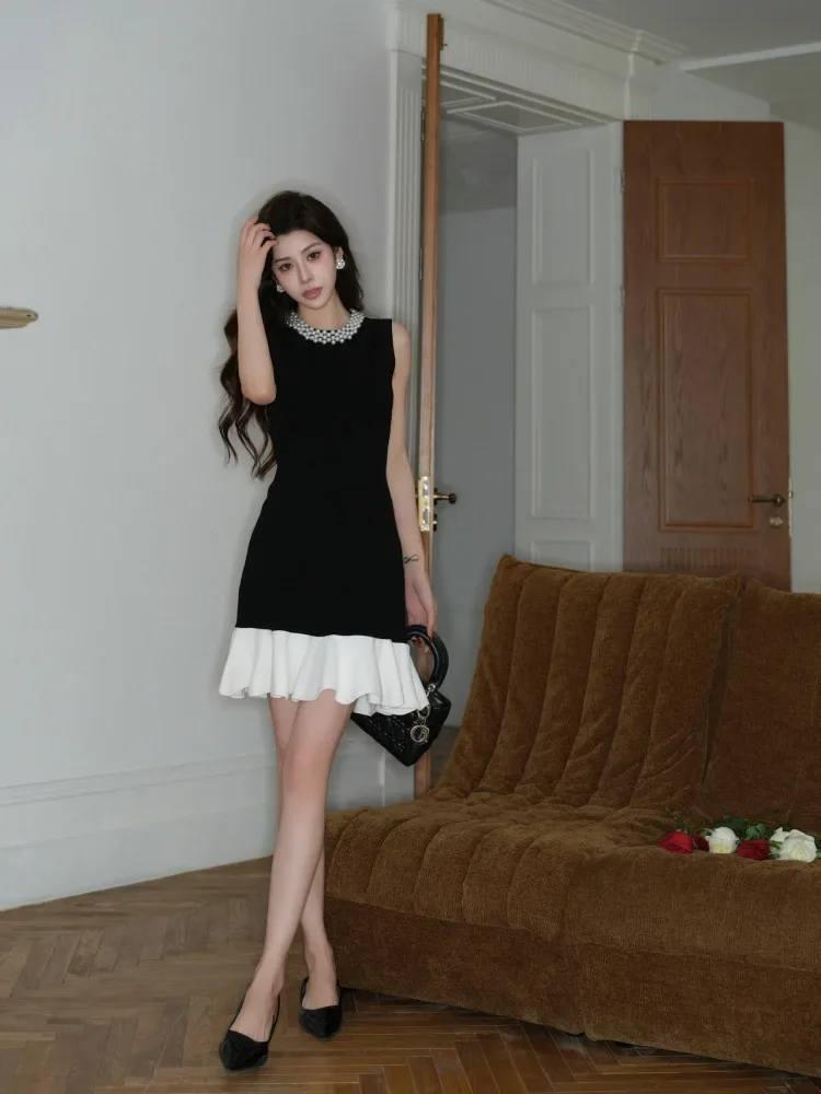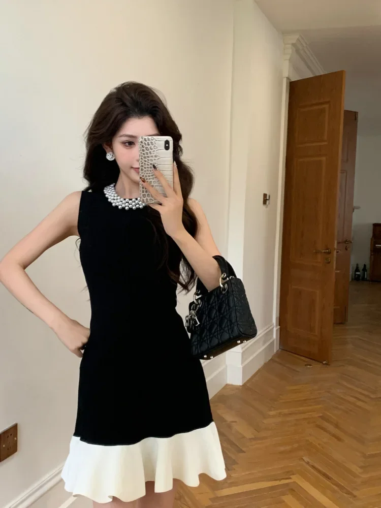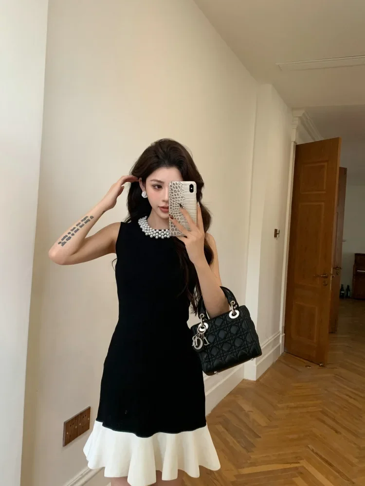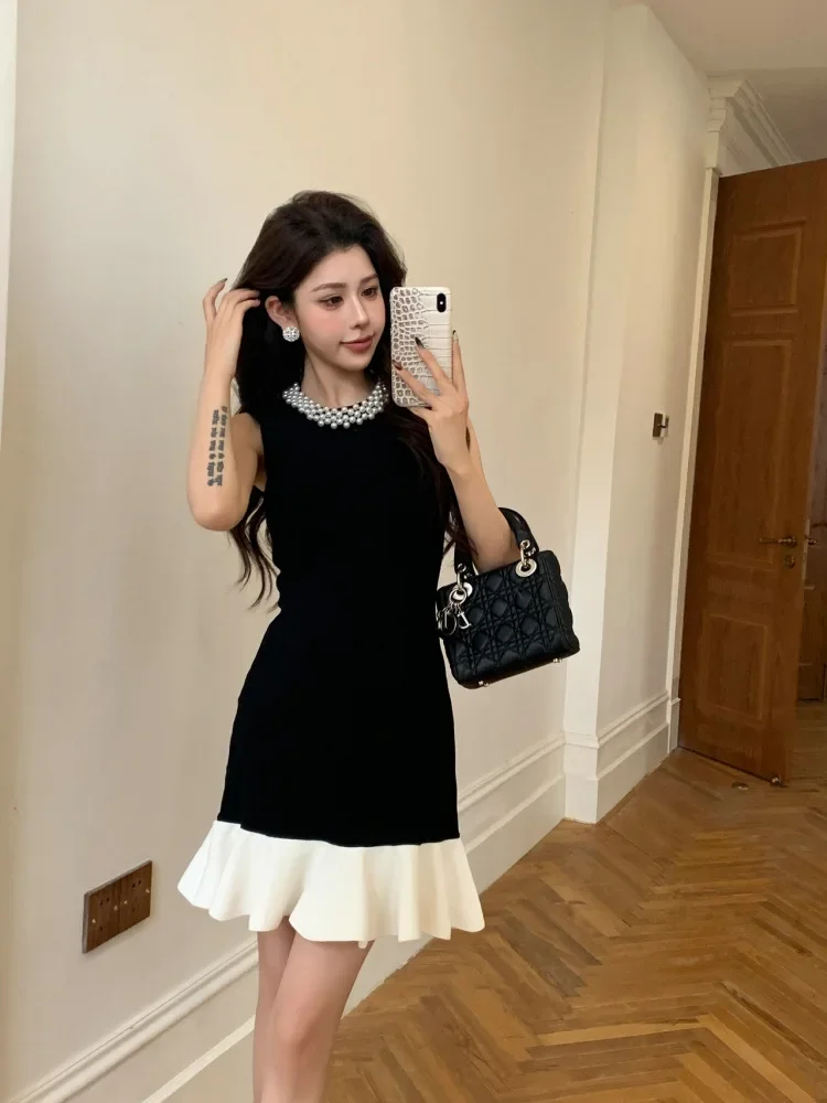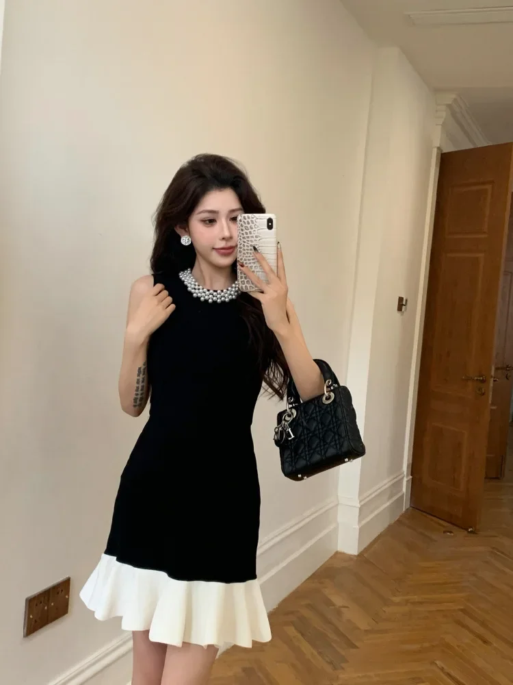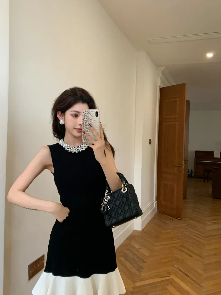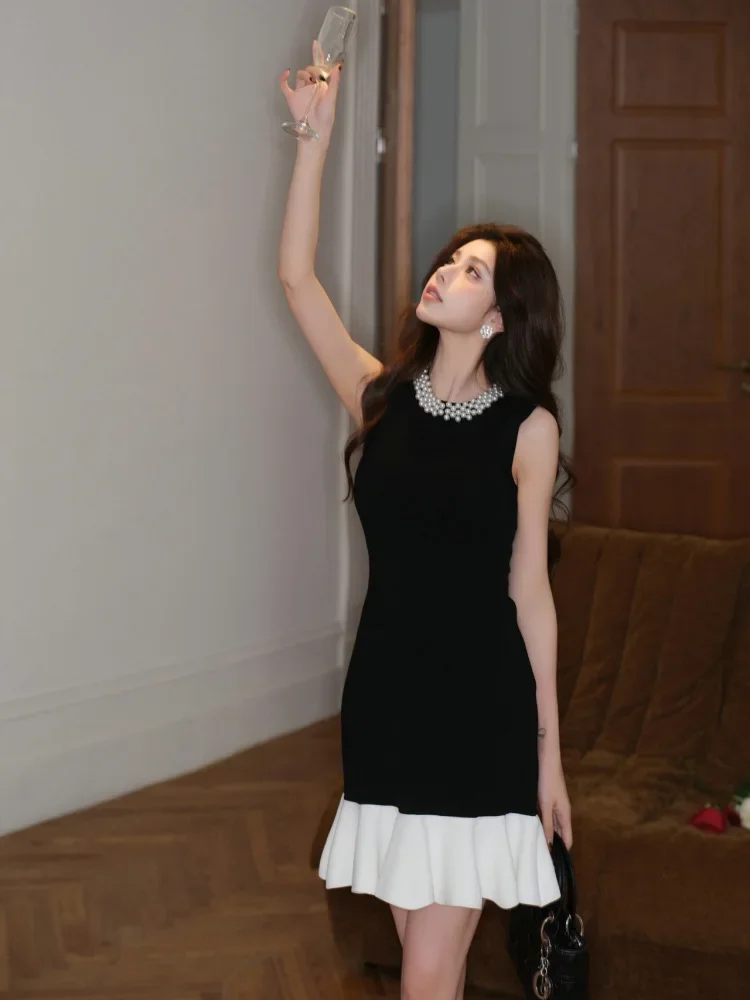 Elegant Pearl Detail Knitted Ice Silk Sleeveless A- Line Dress French Style Summer Dress for Women with Lace Hem Empire Waist