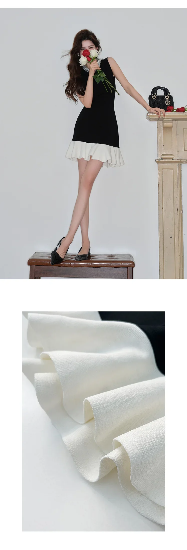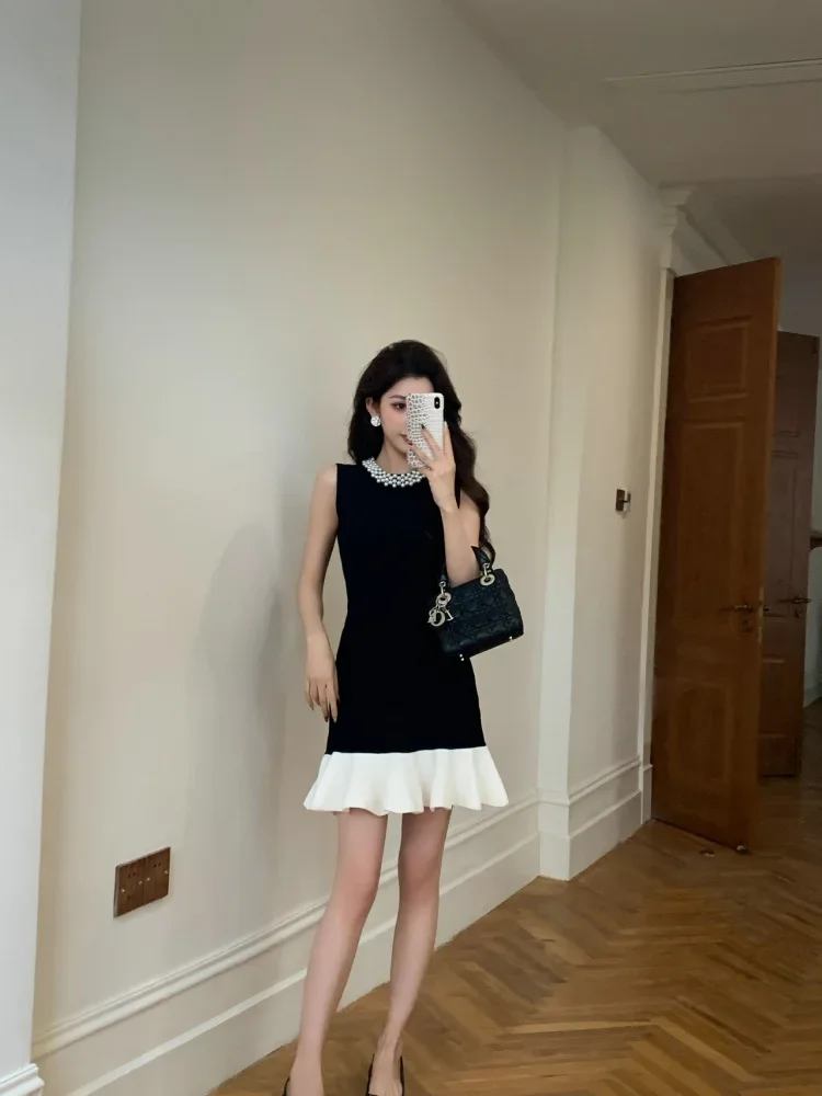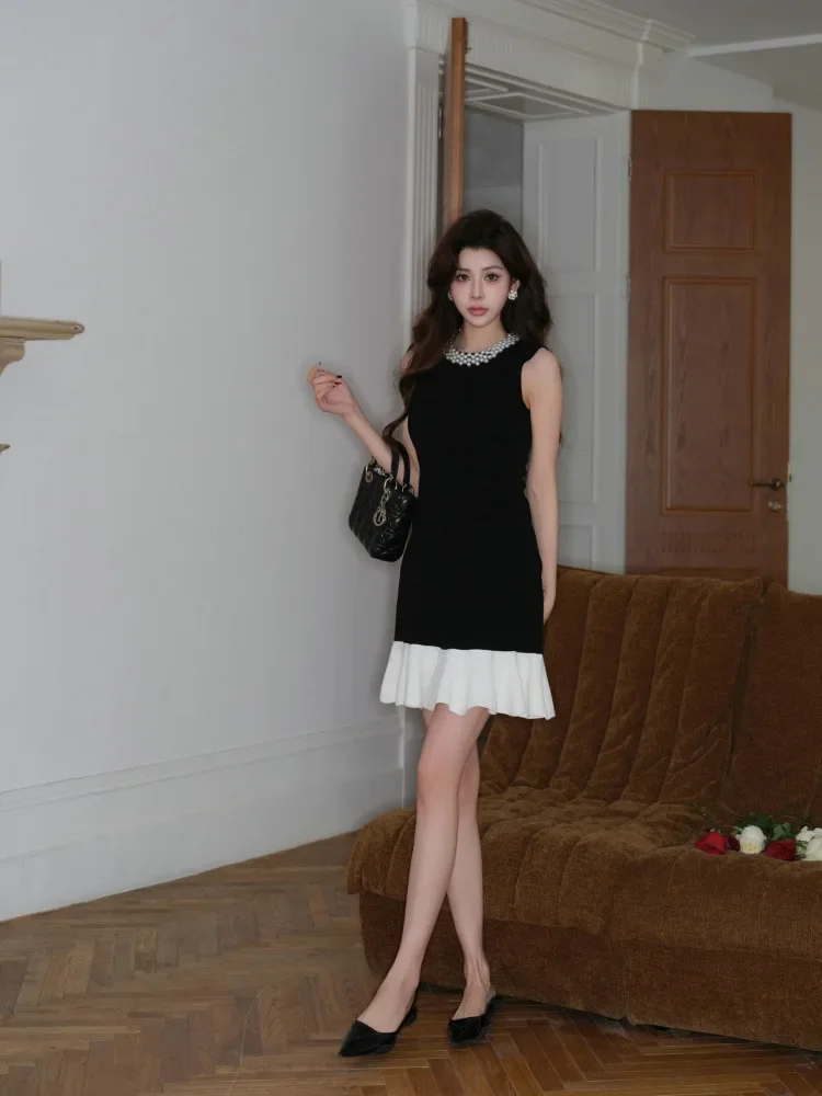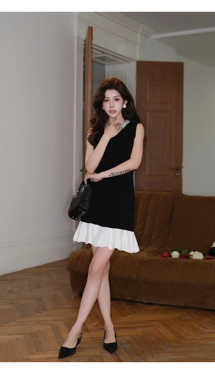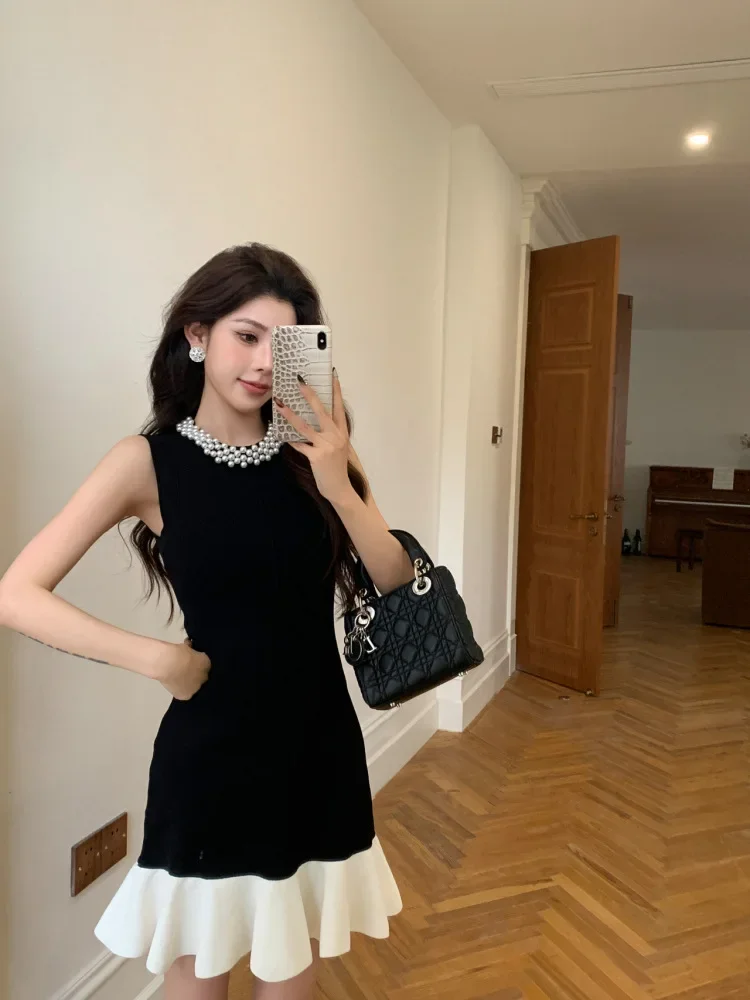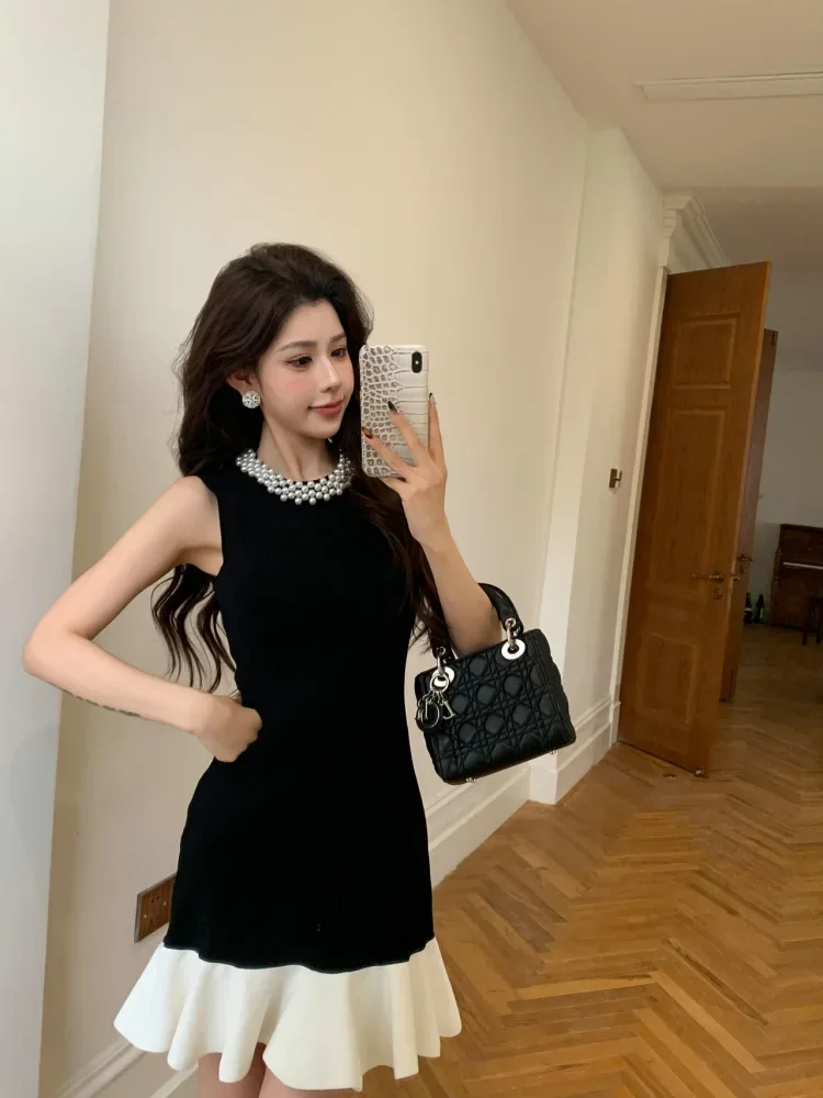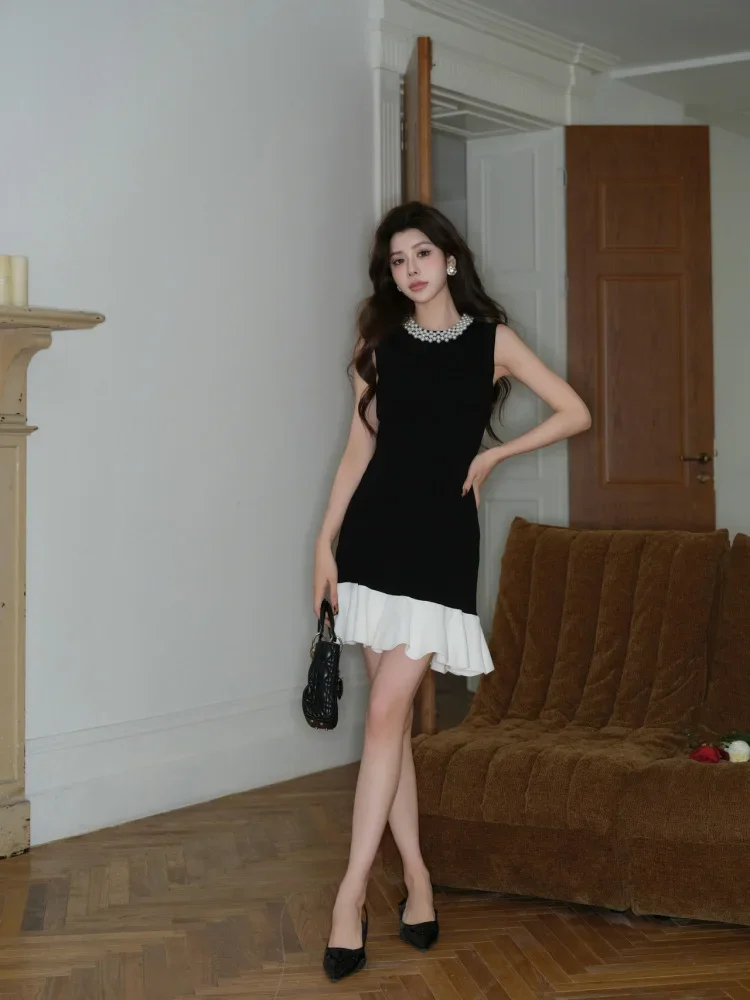 Elegant Pearl Detail Knitted Ice Silk Sleeveless A- Line Dress French Style Summer Dress for Women with Lace Hem Empire Waist