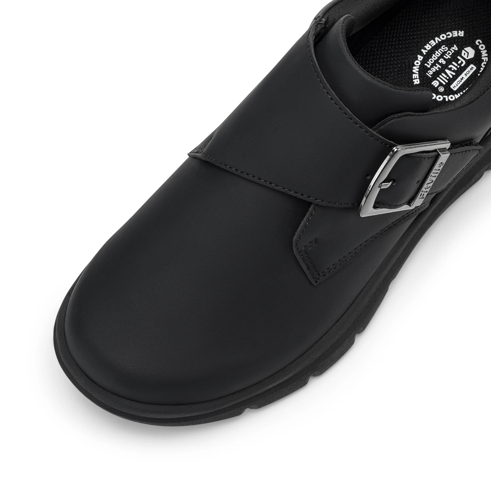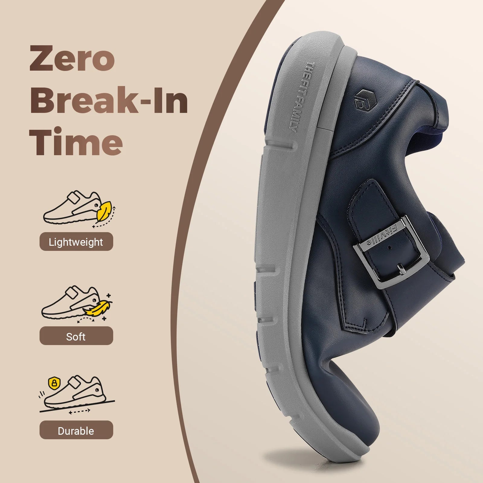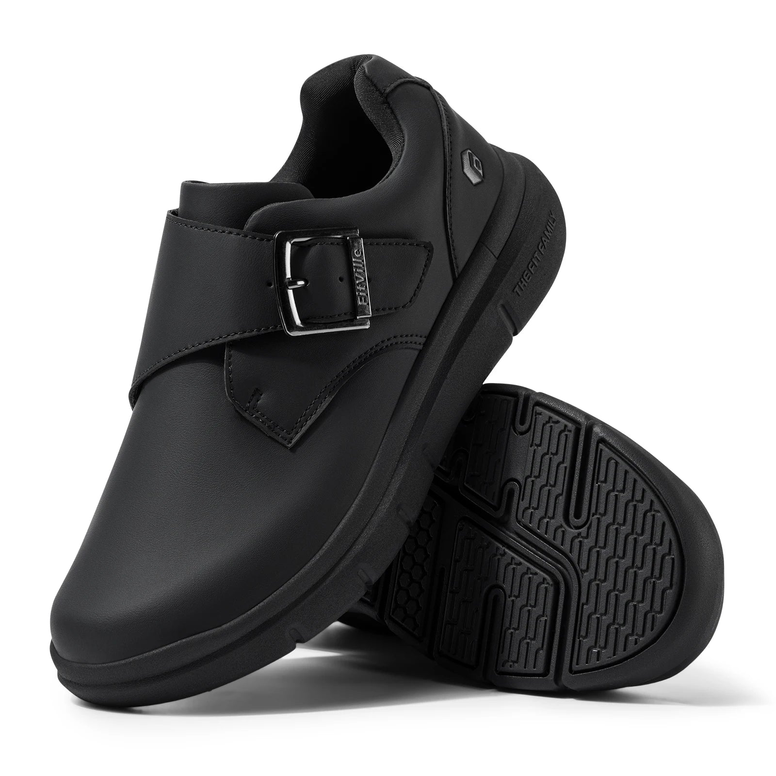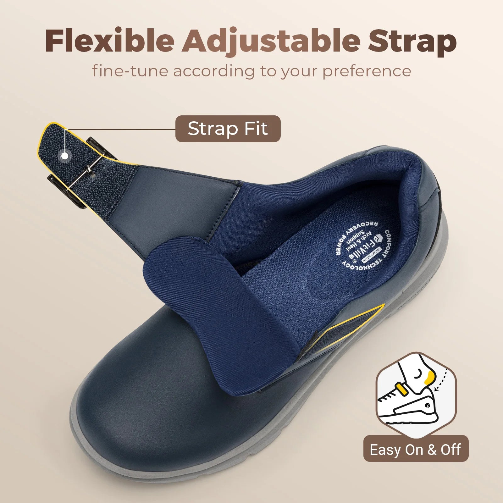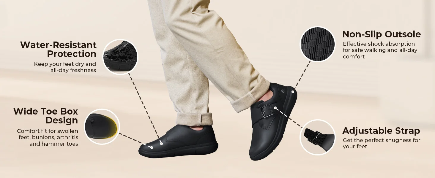 Hook & Loop Closure: Adjustable monk strap that makes easily on and off; Allow for an easy, customized fit, accommodating high insteps and swelling without the need for bending