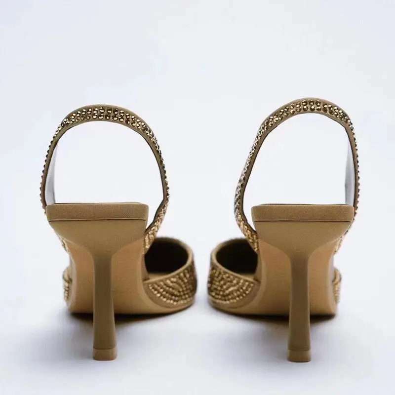 Gold Women Heels Sandals 2024 Summer Crystal Pointed Toe Female Stiletto African Party Rhinestone Shallow Slip on Heel Shoes