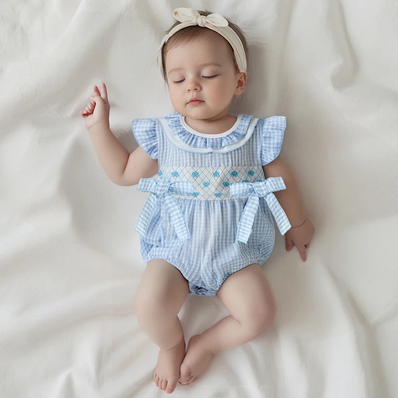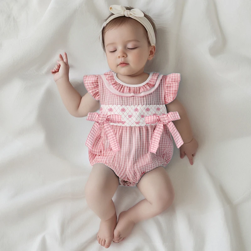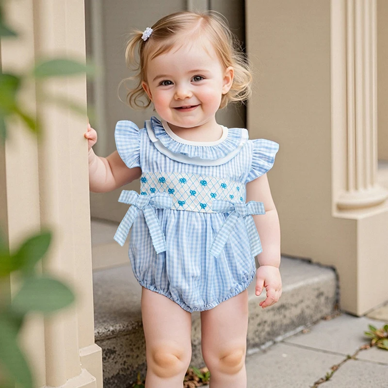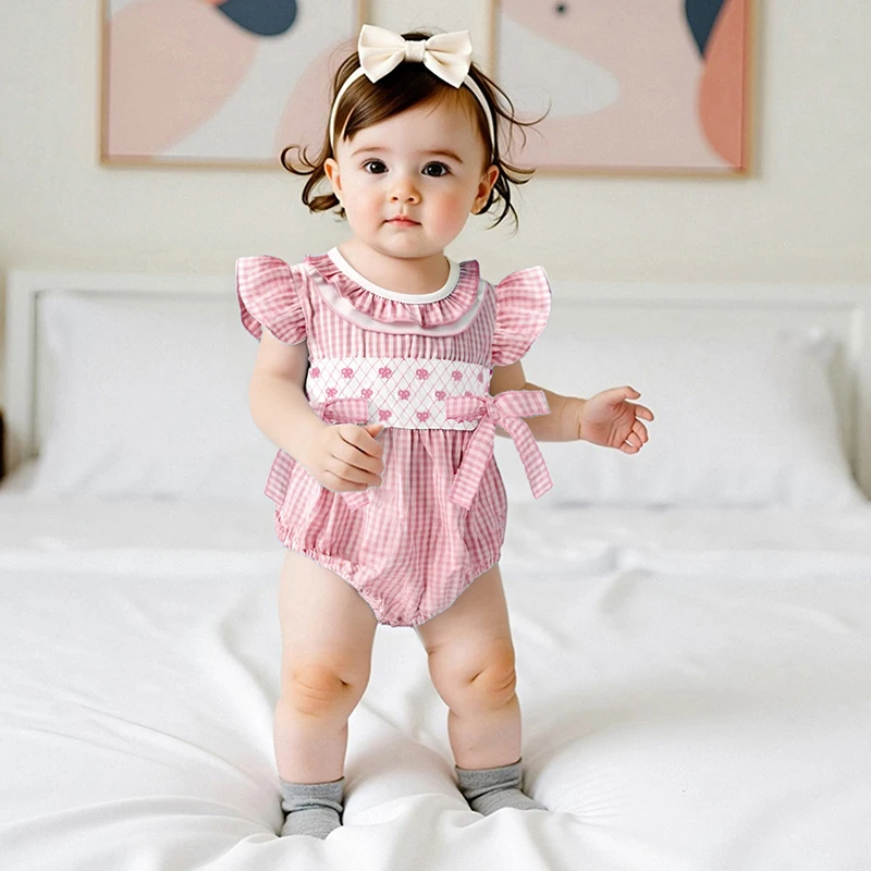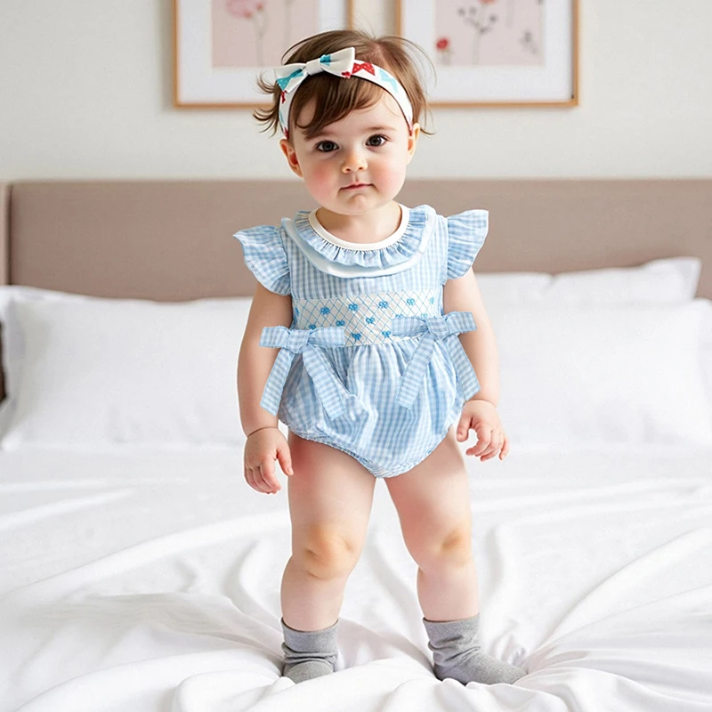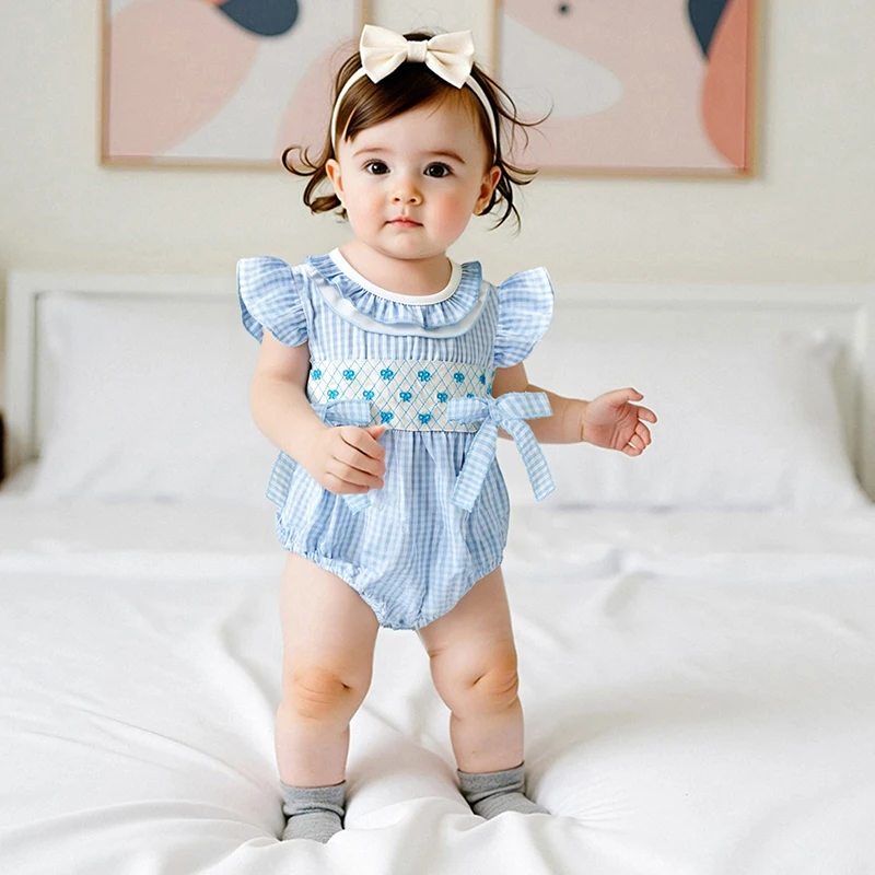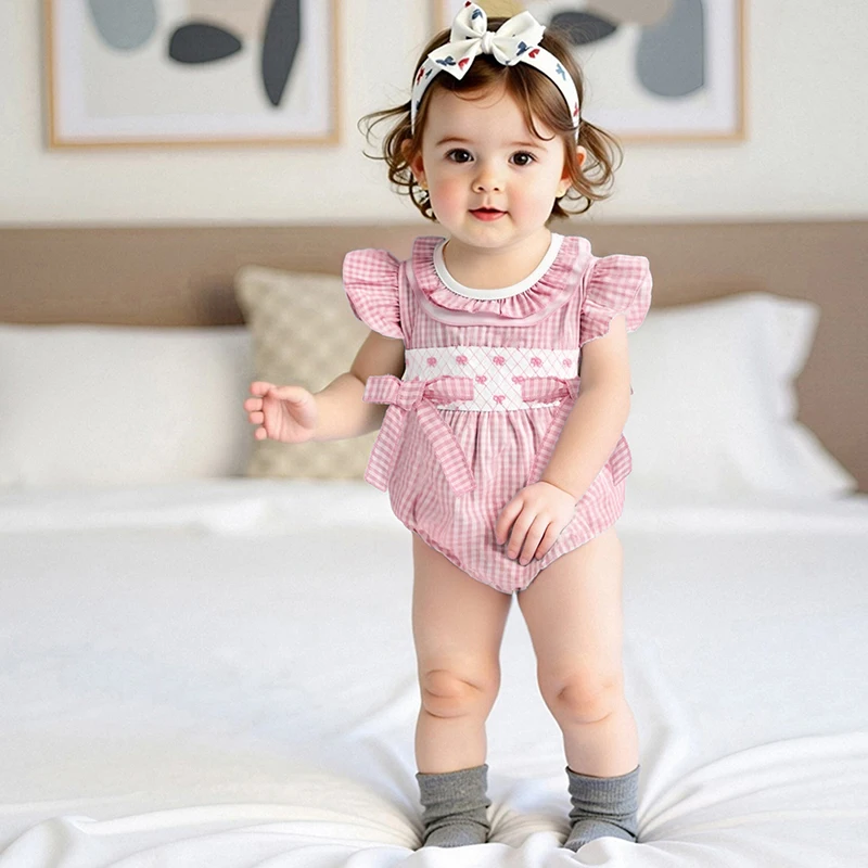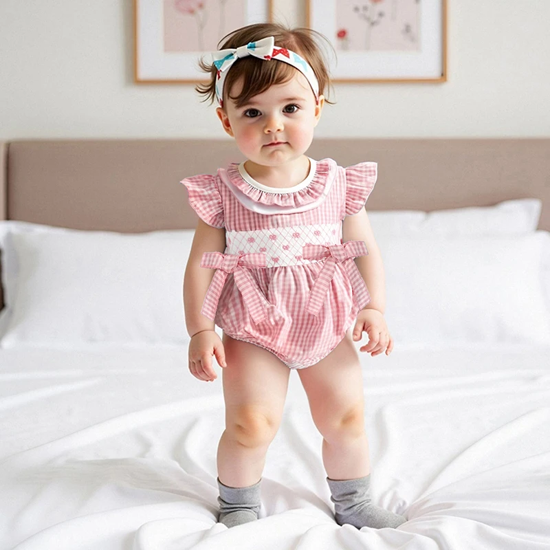 Baby Girls Rompers Bow Embroidery Plaid Ruffles Round Neck Fly Sleeve Infant Bodysuits Jumpsuits