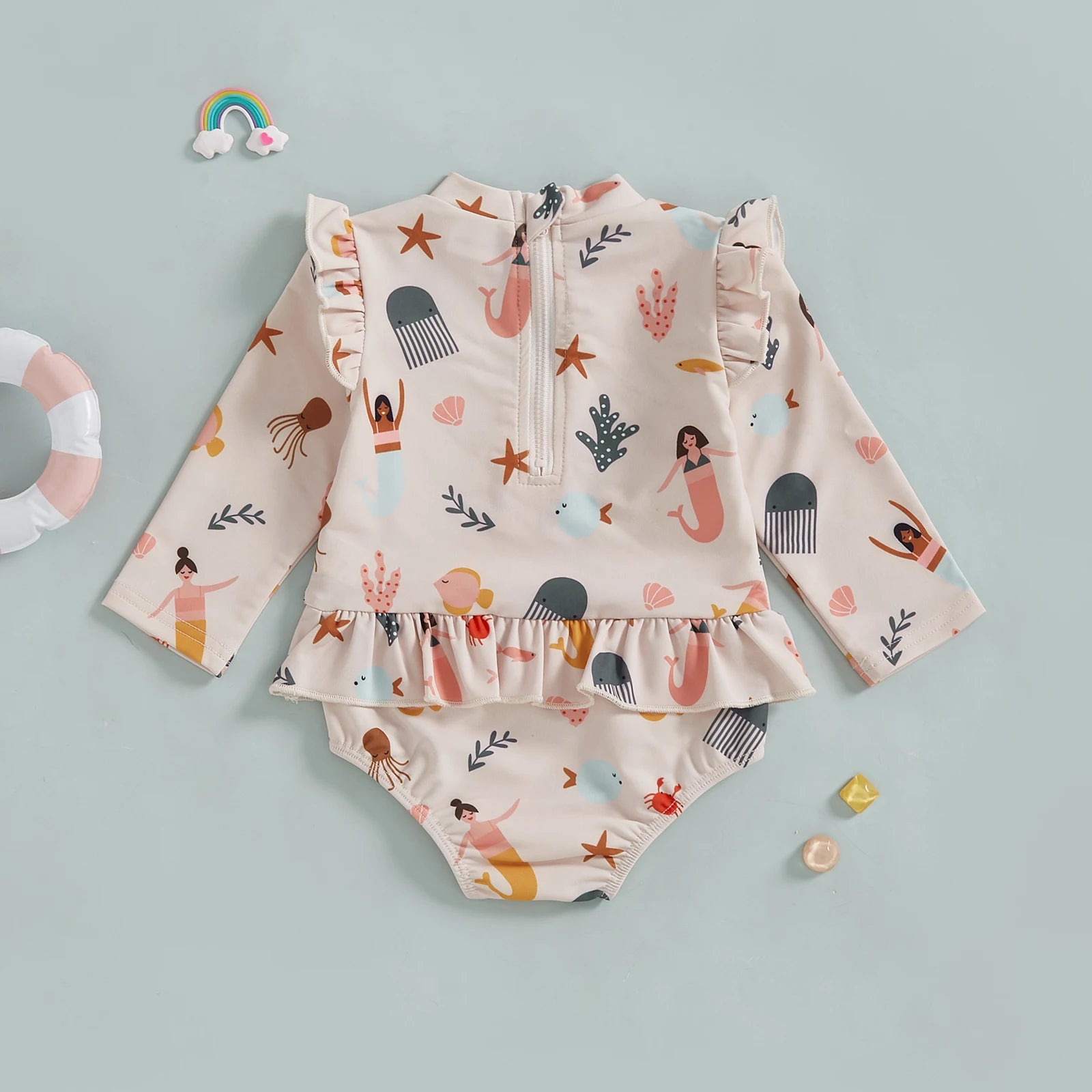 Baby Girls Rash Guard Swimsuit Rompers Long Sleeve Ocean Elements Print Toddler Ruffles Bathing Suit Swimwear