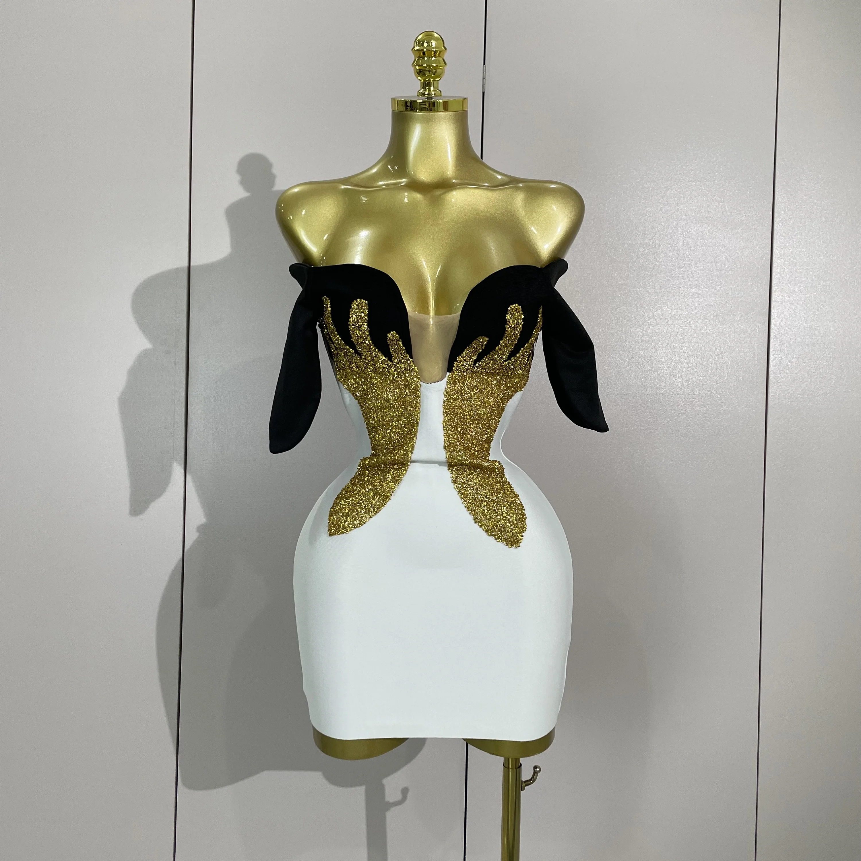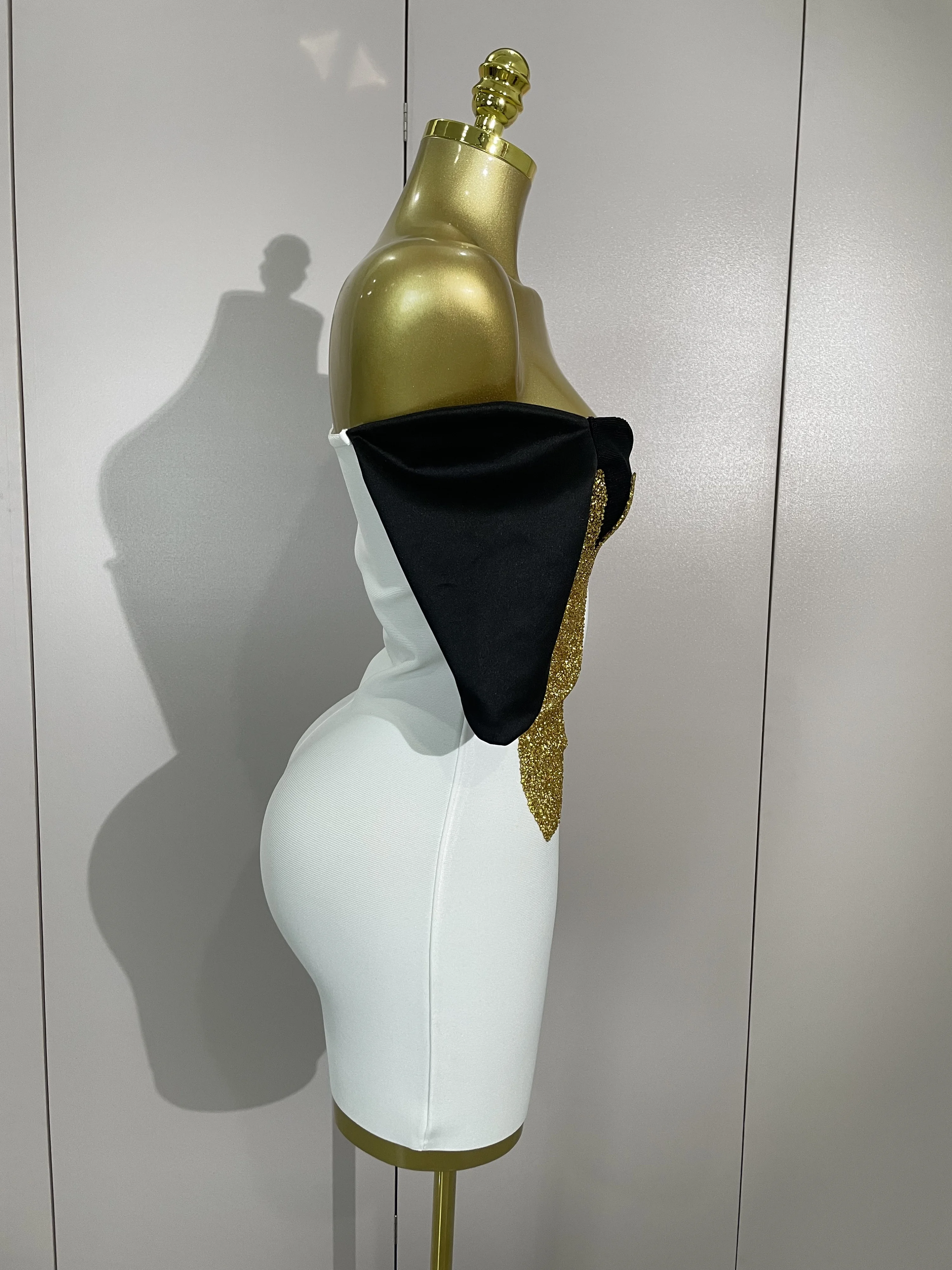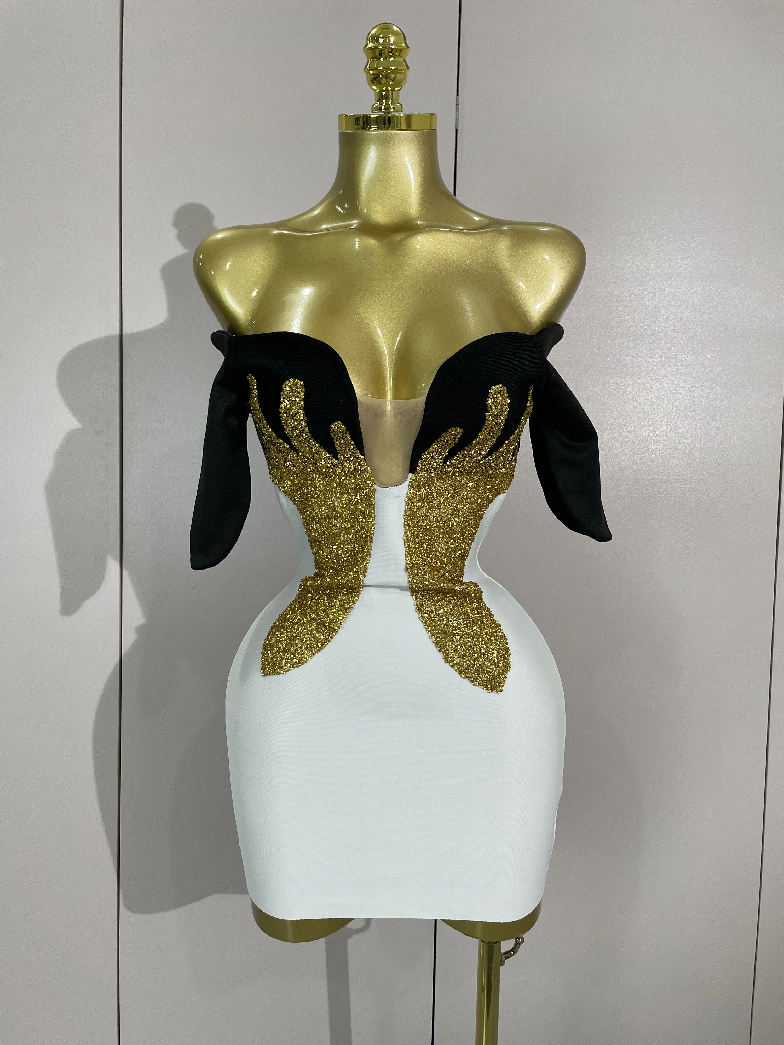 New Arrivals Sexy Shiny Golden Fine Diamonds White Bandage Mini Dress Women Celebrate Evening Prom Birthday Party Cocktail Dress