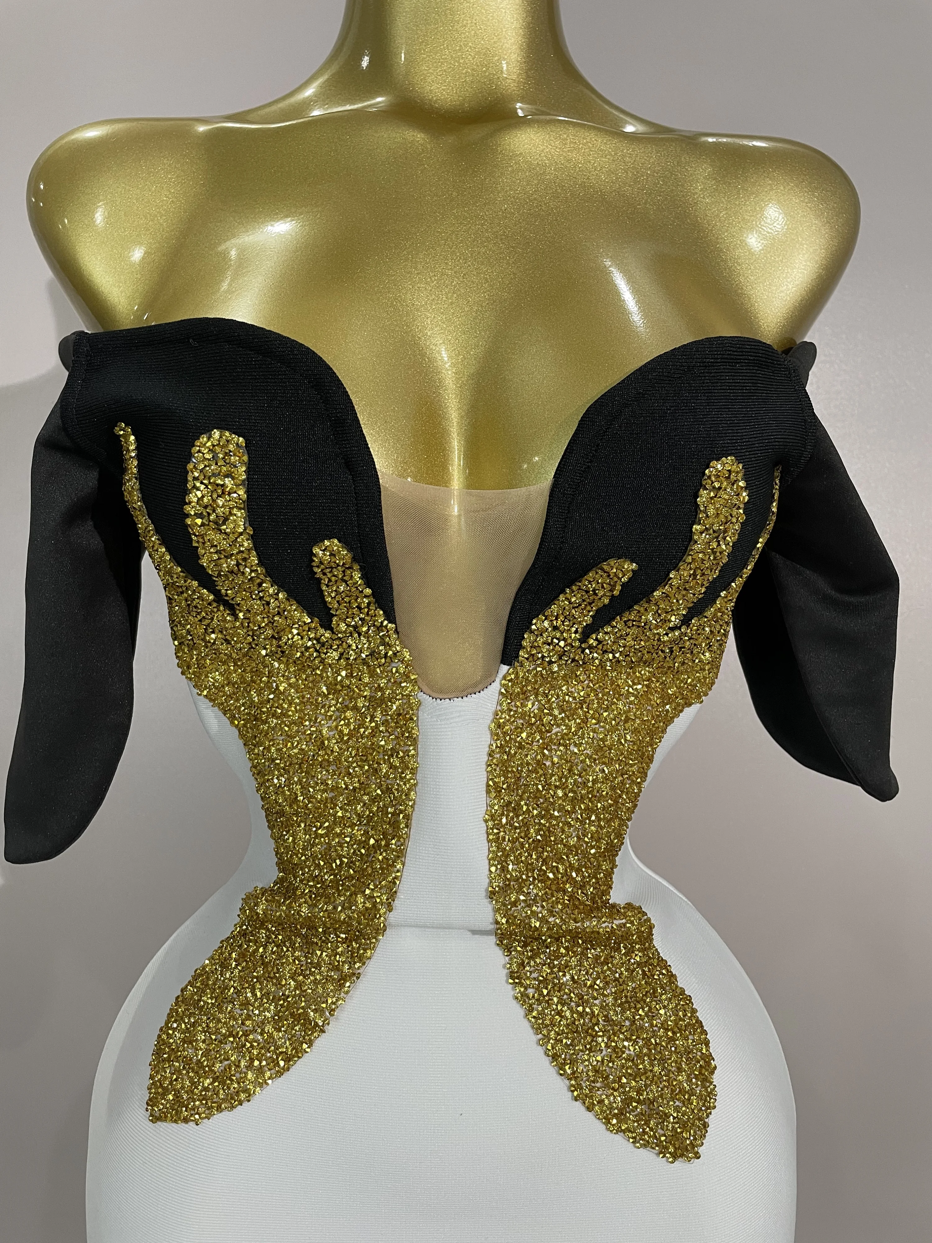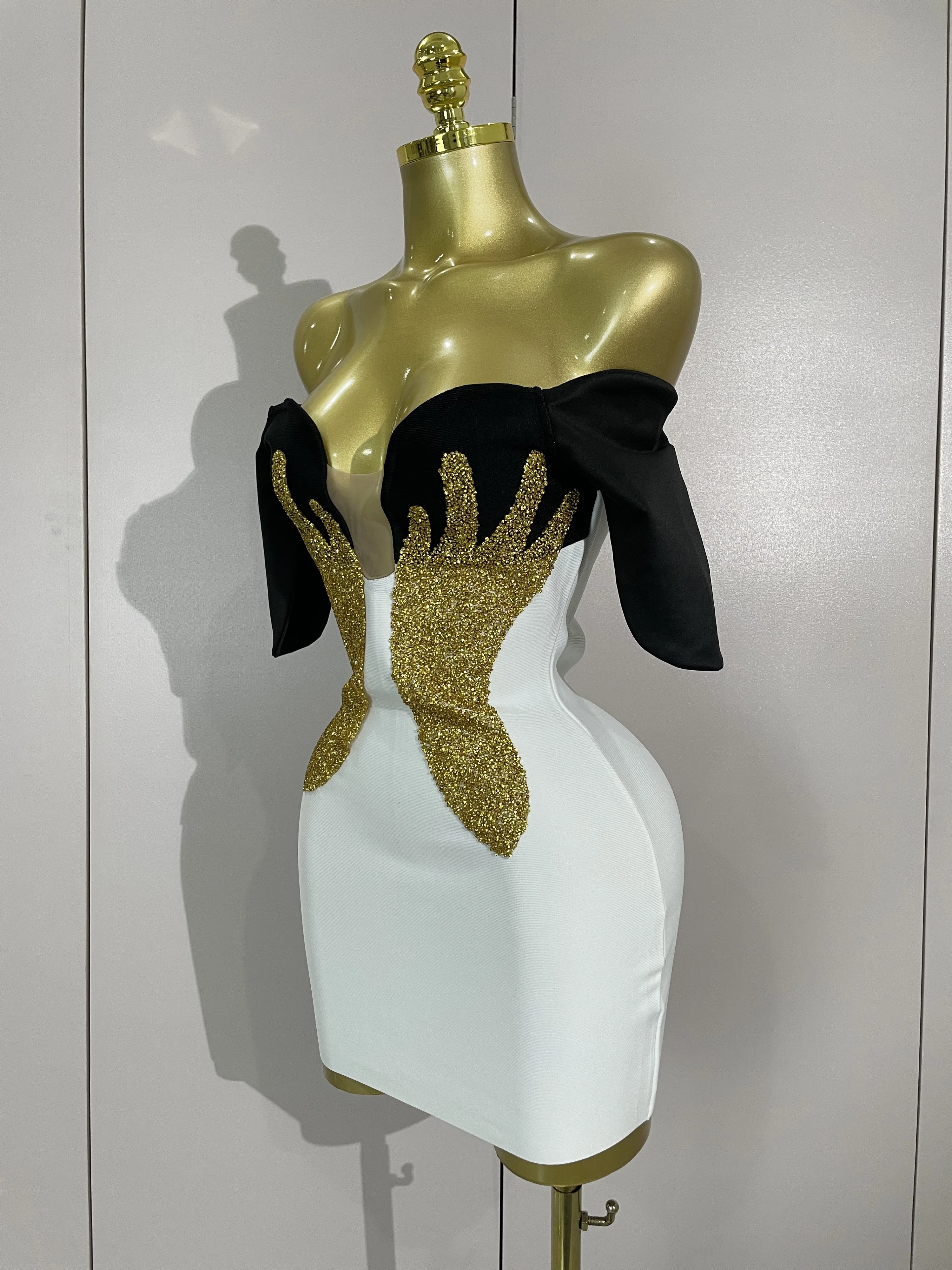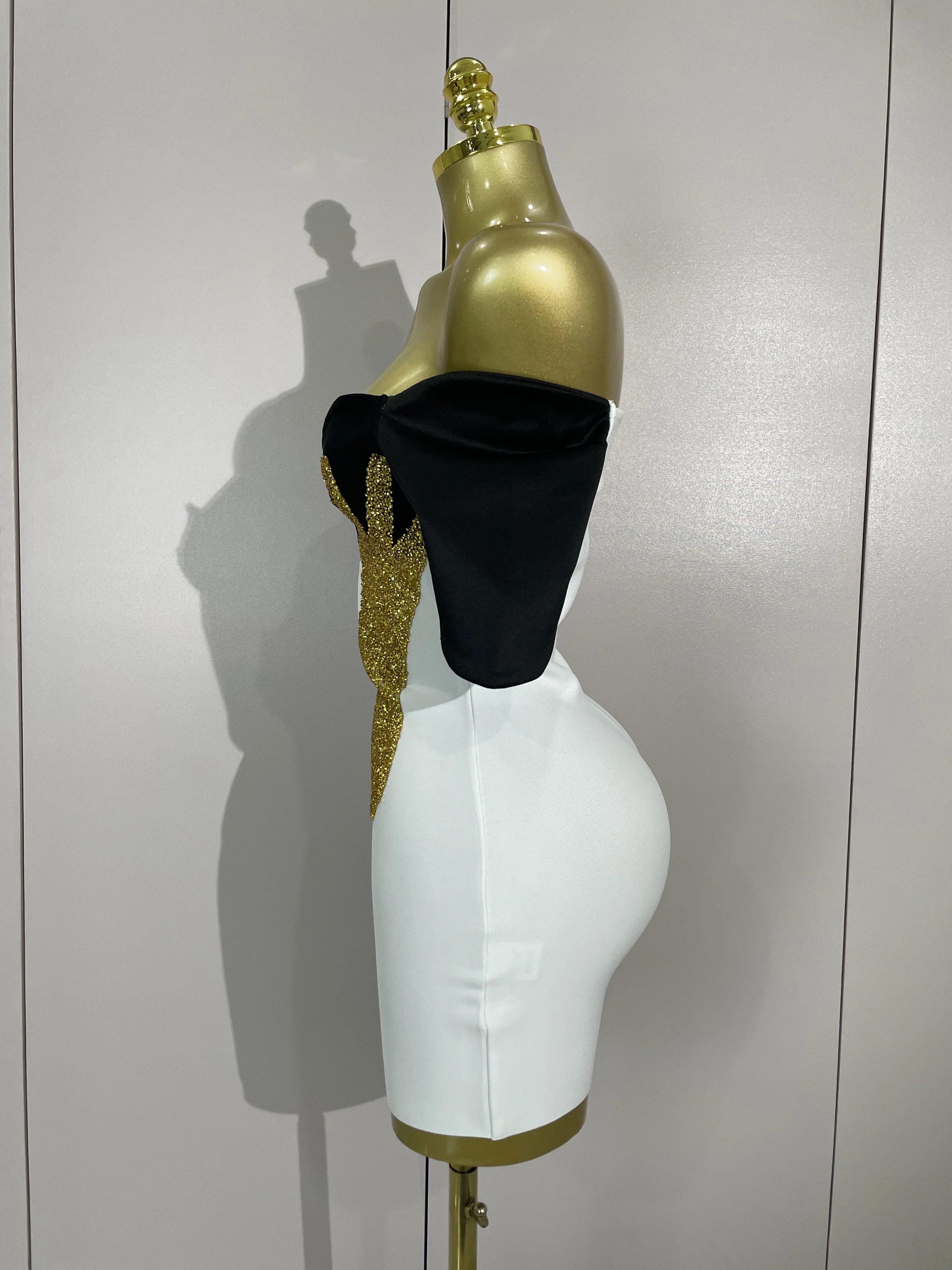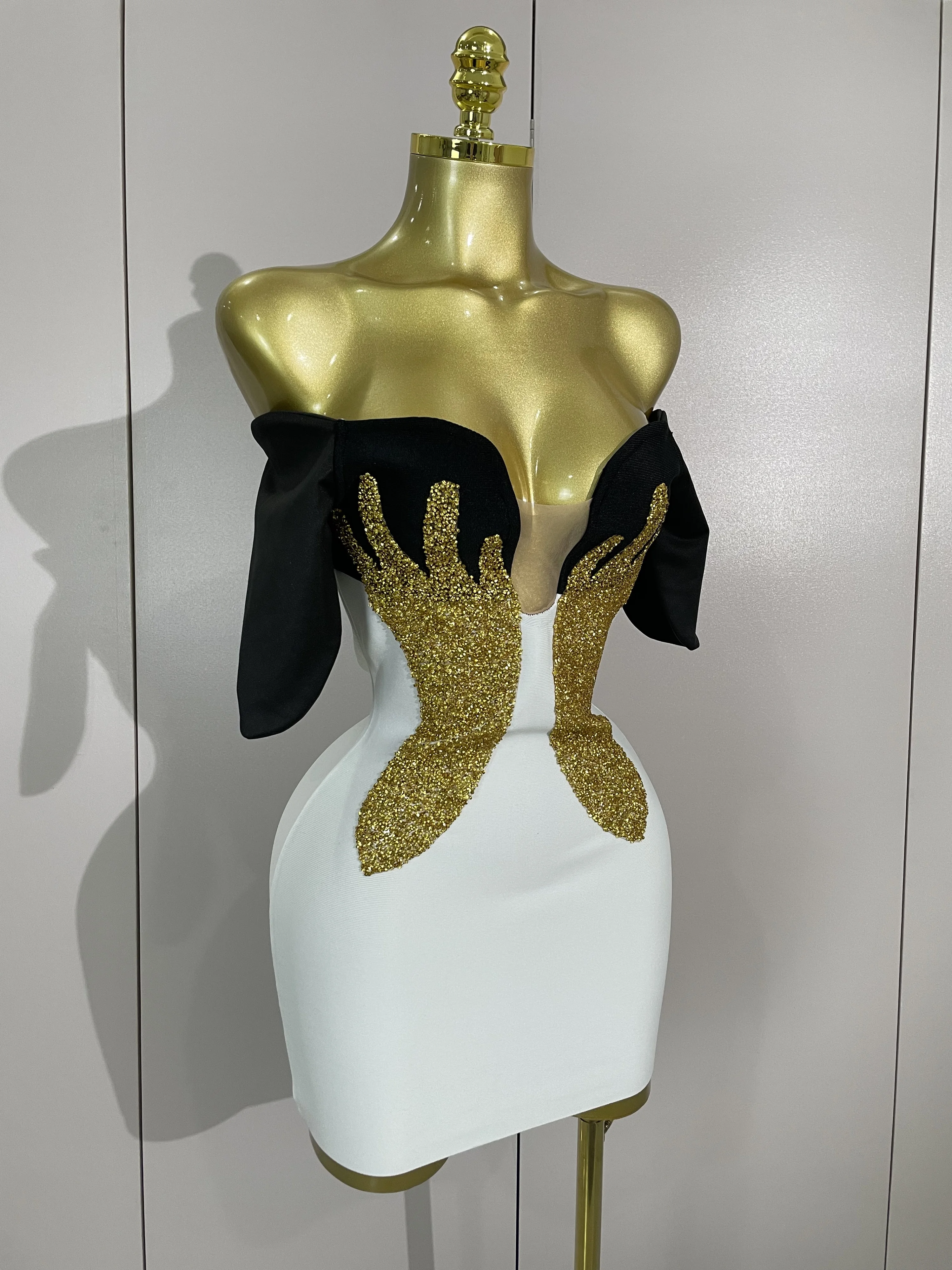 New Arrivals Sexy Shiny Golden Fine Diamonds White Bandage Mini Dress Women Celebrate Evening Prom Birthday Party Cocktail Dress