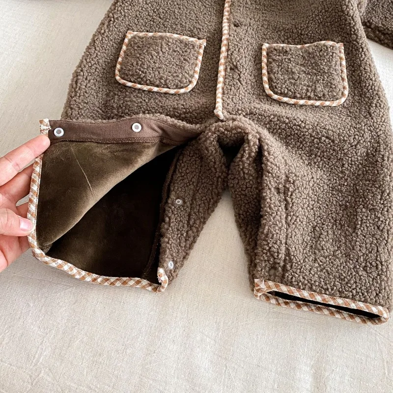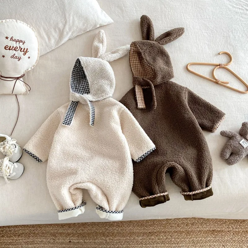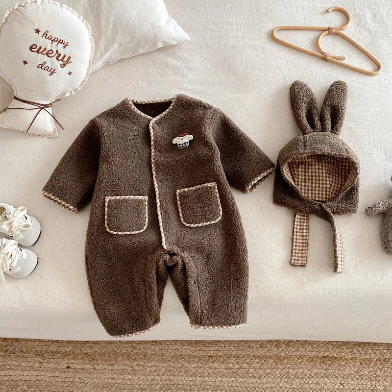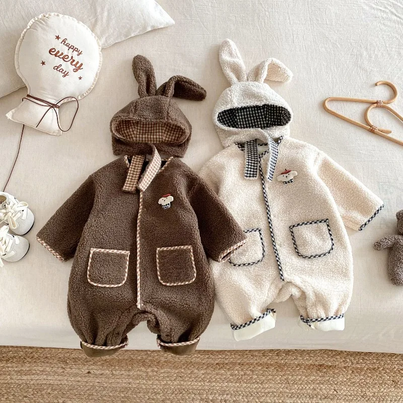 New Autumn Winter Baby Girl Boy Romper with Bunny Hat Cute Pocket Design Warm Infant Long Sleeve One-Piece Jumpsuit B5066