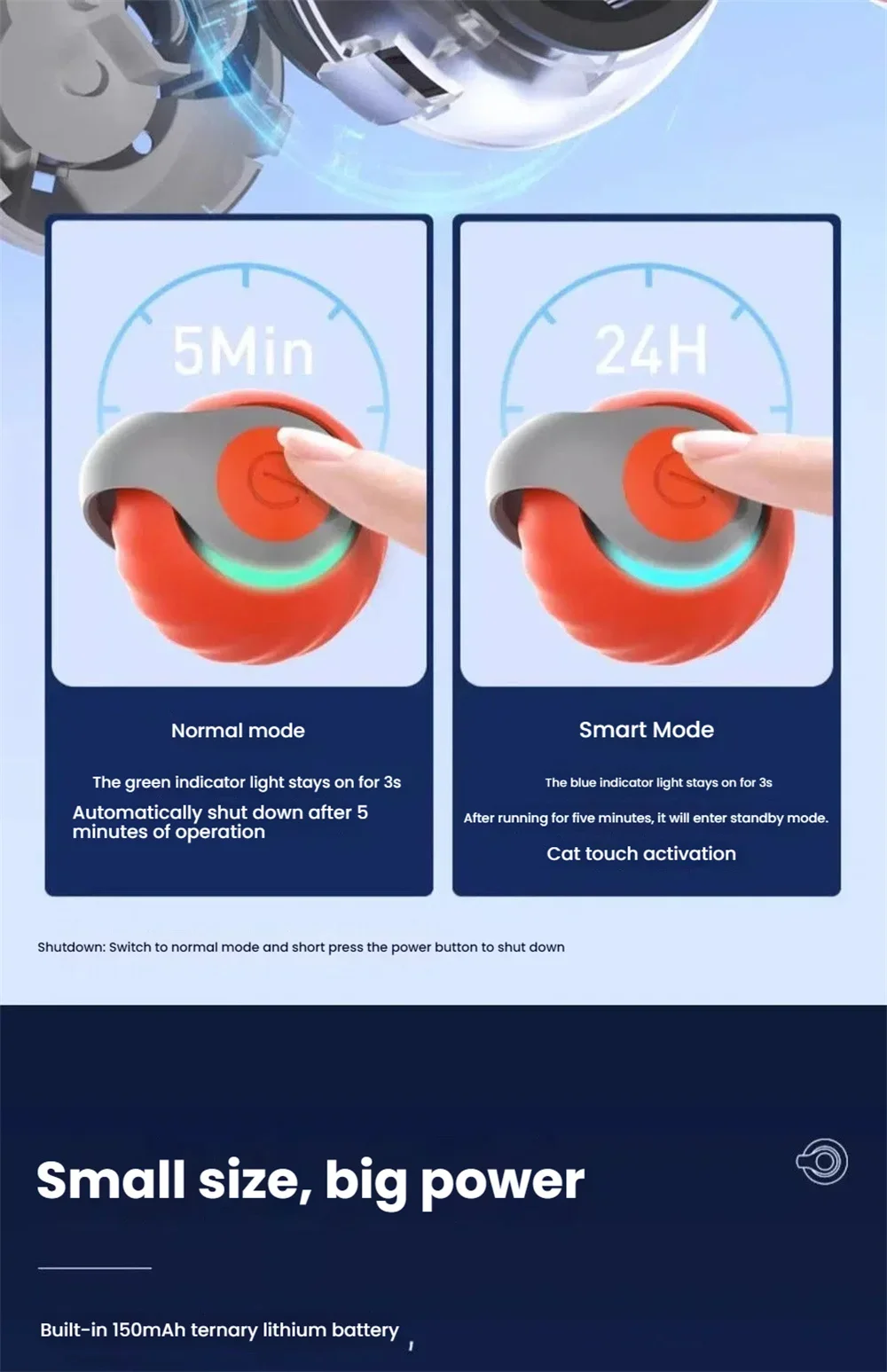Interactive Mode: Blue LED stays on for 3 seconds; enters standby after 5 minutes and reactivates when touched by pets.