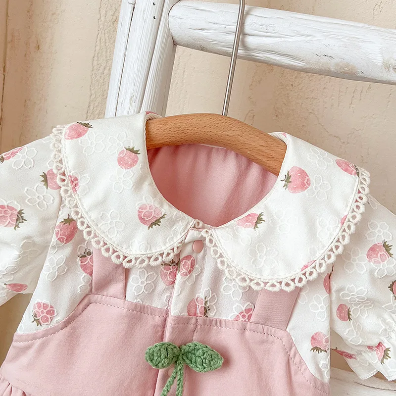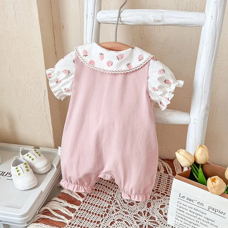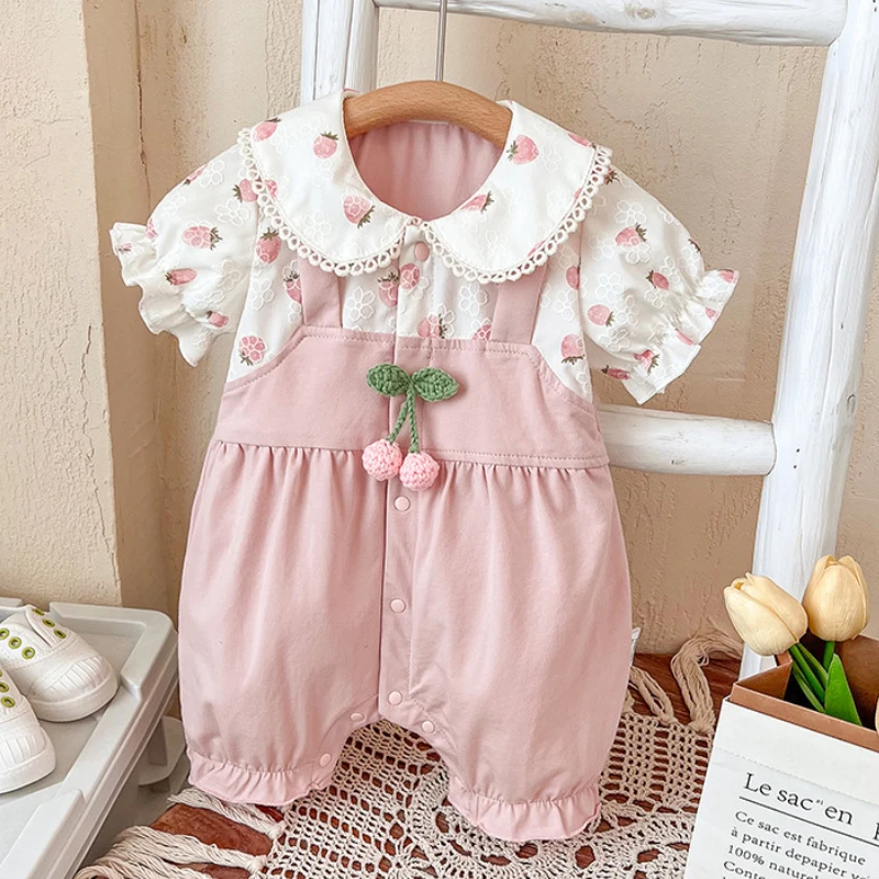 Summer Baby Girls Thin Rompers Lace Peter Pan Collar Puff Sleeve Cute Strawberry Print Jumpsuit Newborn Birthday Clothes E24256