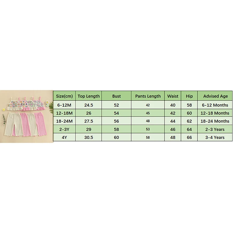6-12M Tops Length: 9.65 Bust: 20.47 Pants Length: 16.54 Waist: 15.75 Hip: 22.83 Advised Age: 6-12 Months