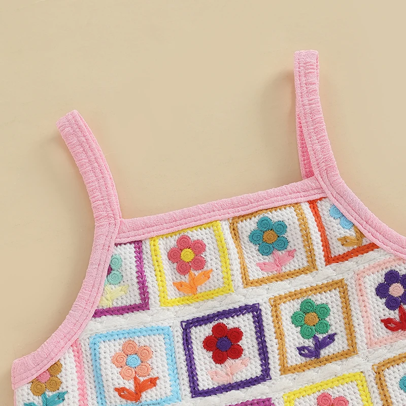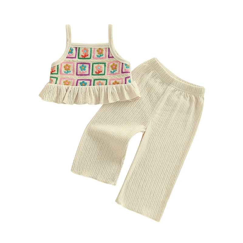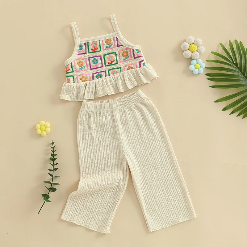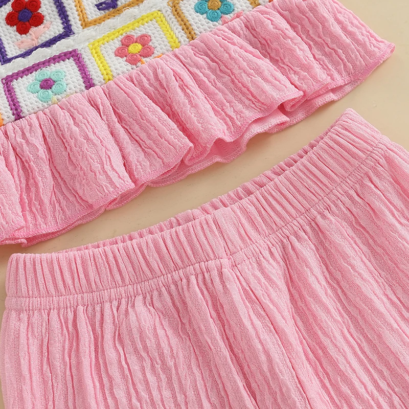 Toddler Girl Crochet Outfit Crochet Floral Crop Top Sleeveless Camisole Ruffle Top and Pant Set Baby Summer Clothes