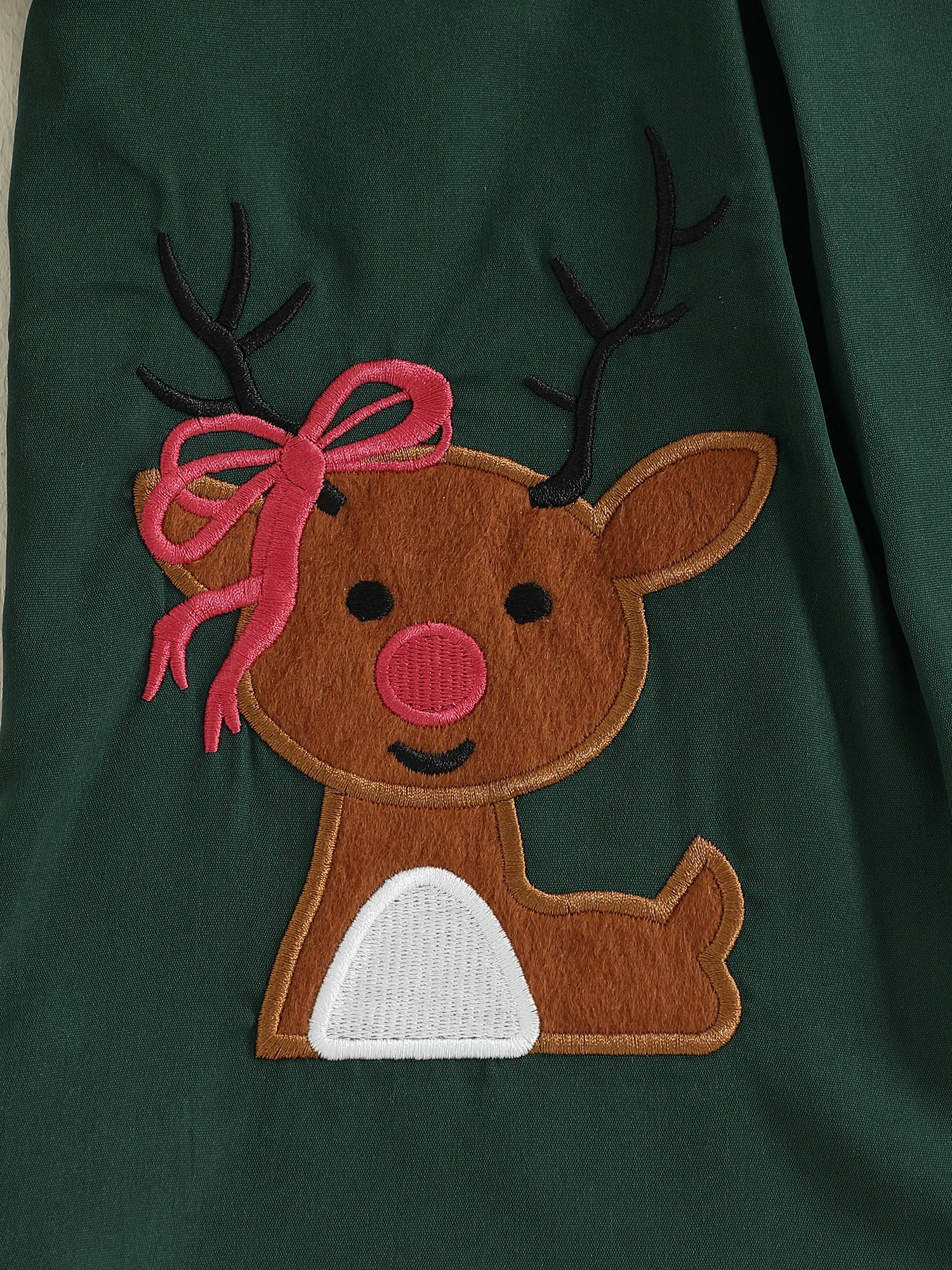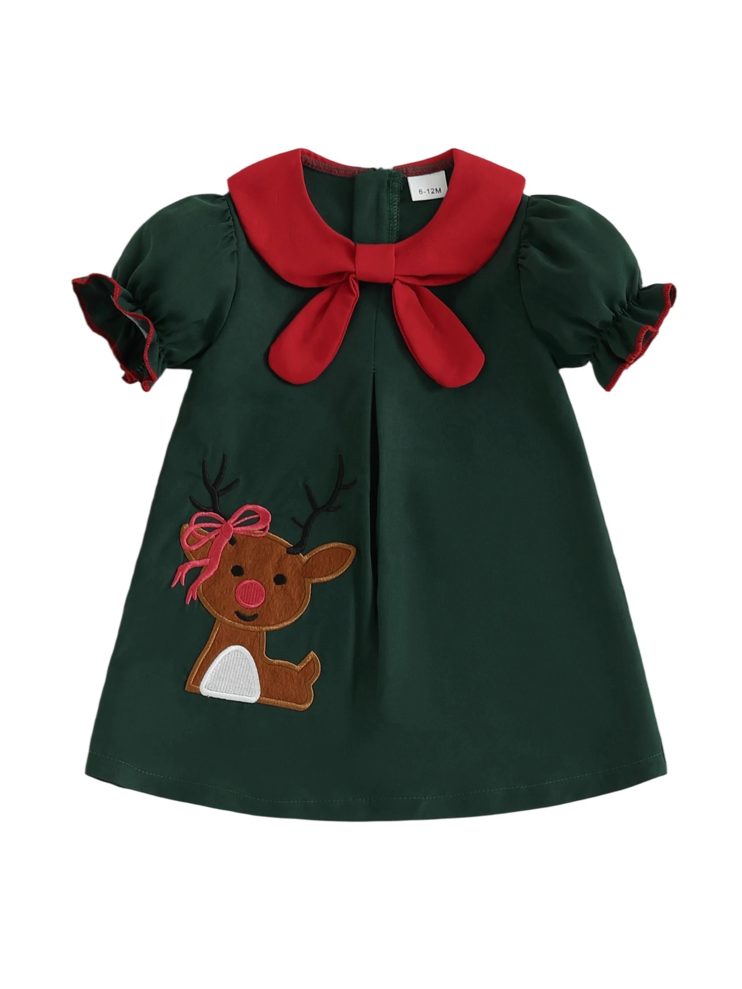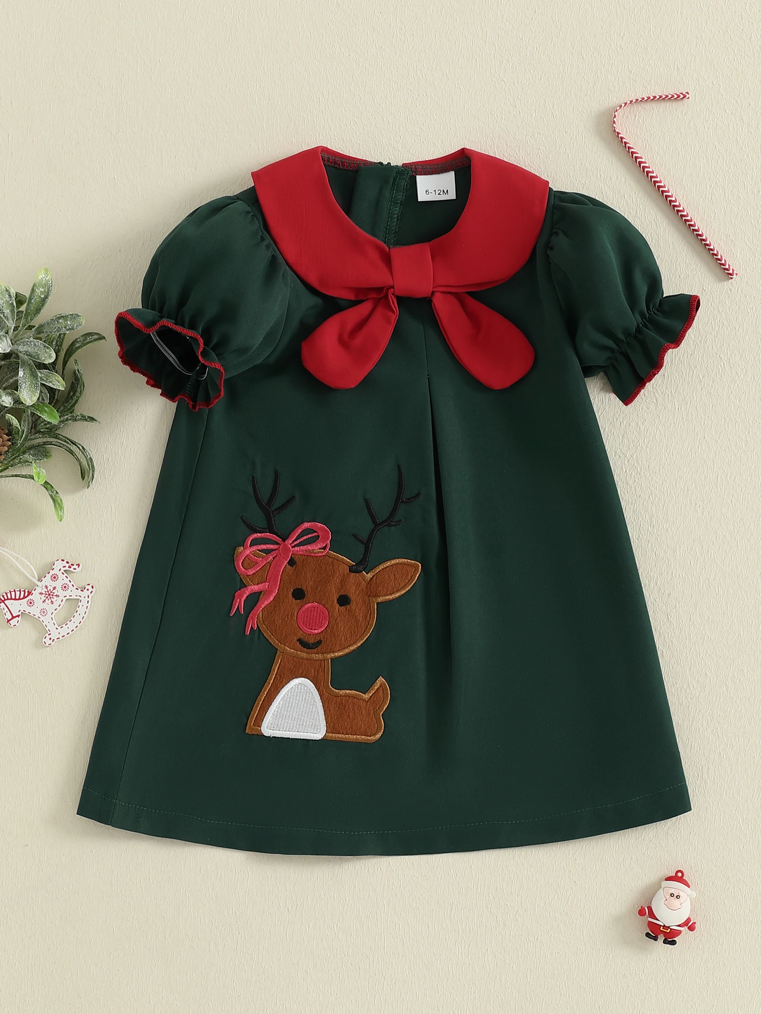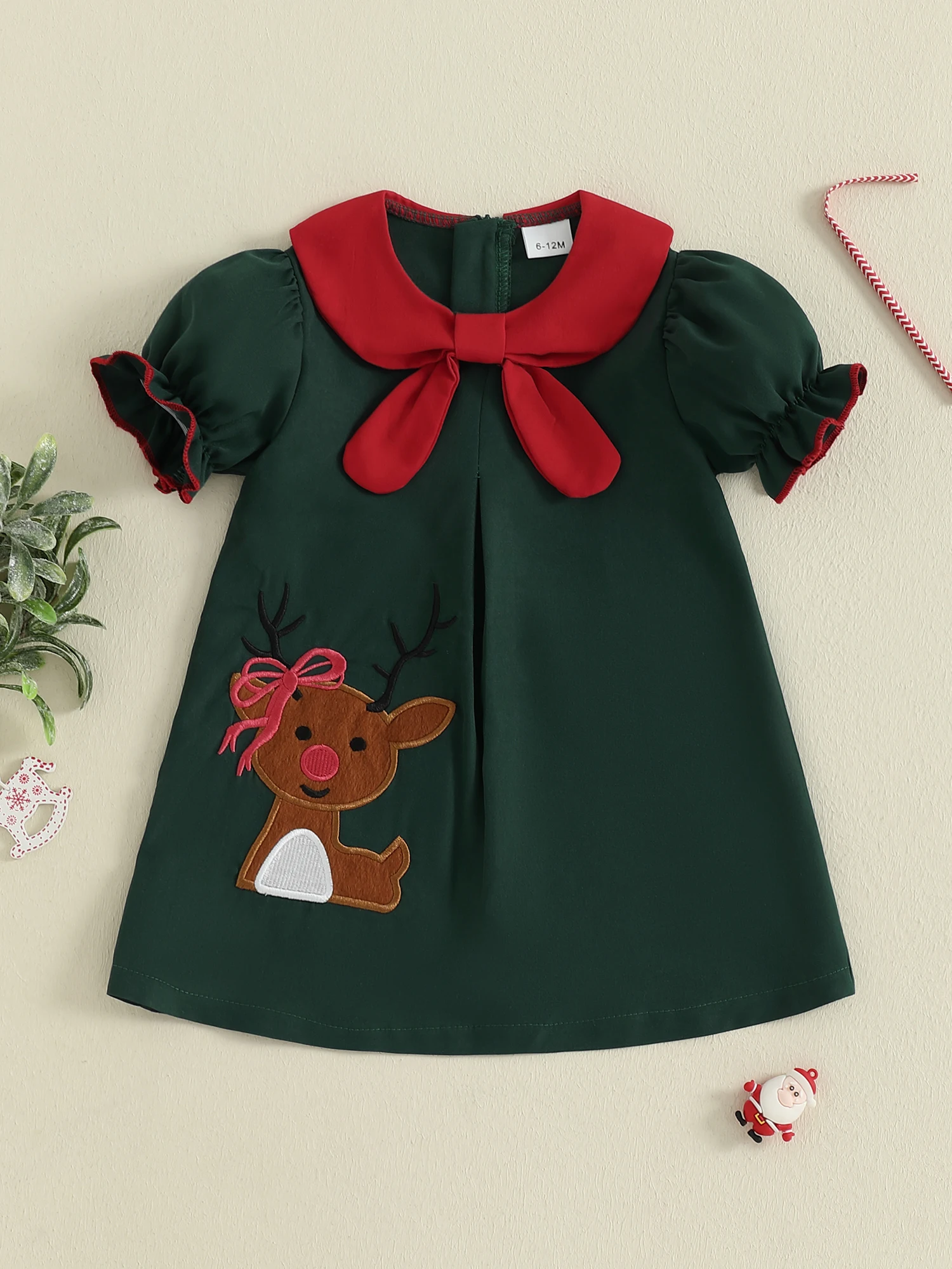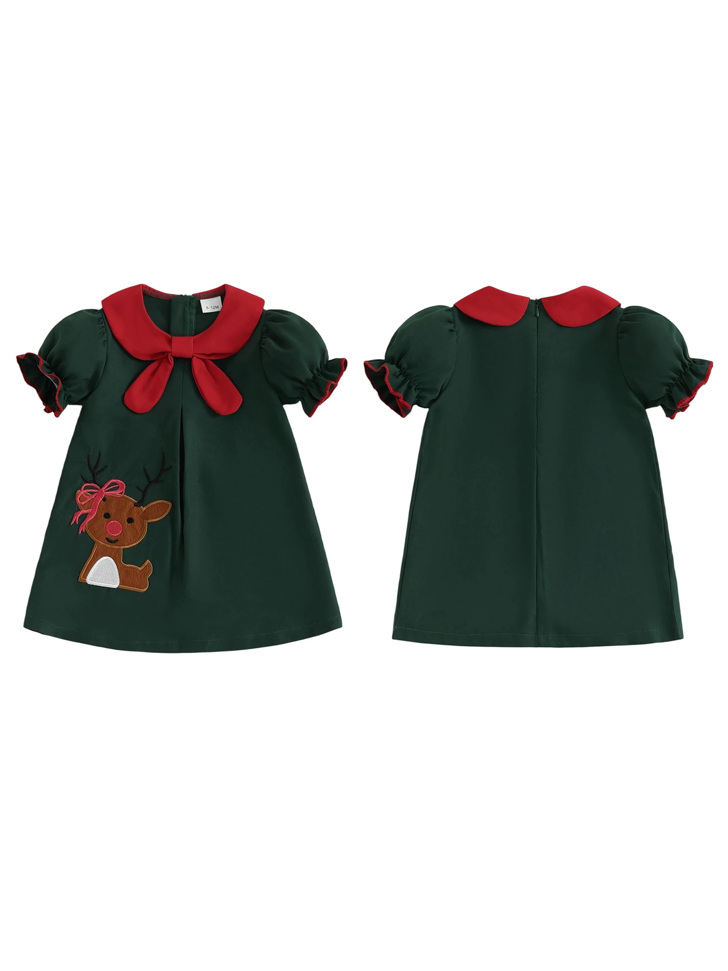 Toddler Girl Christmas Dress Reindeer Embroidered Doll Collar Short Sleeve A-line Dress Cute Holiday Clothes