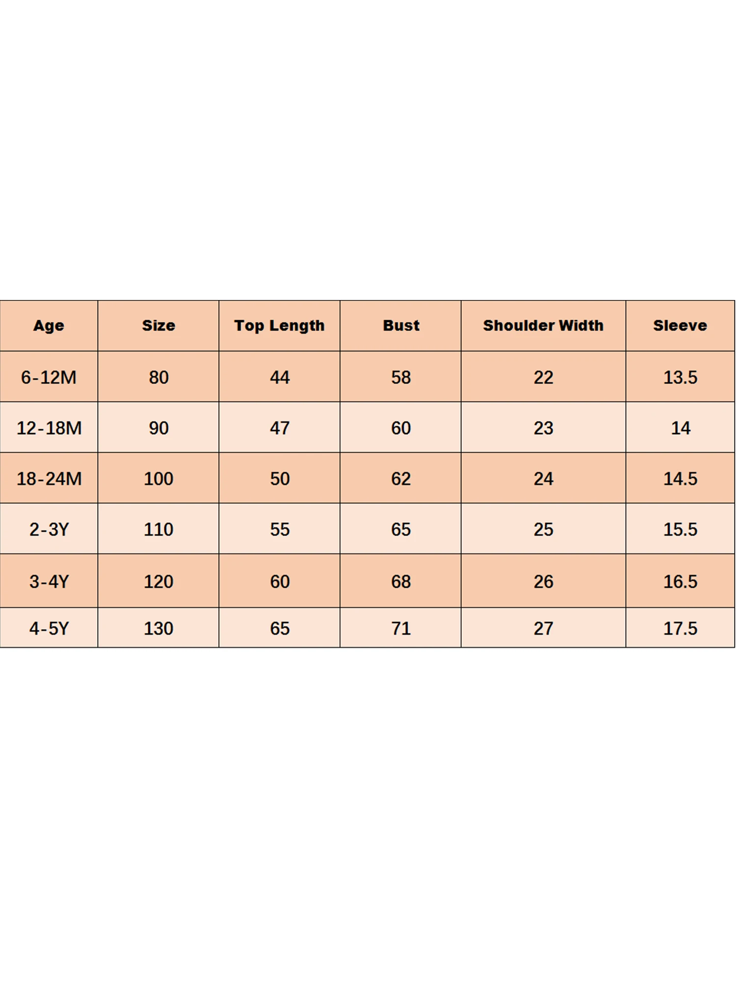 100 Length: 19.68 Bust: 24.41 Sleeve: 5.71 Shoulder: 9.45 Advised Age: 18-24 Months